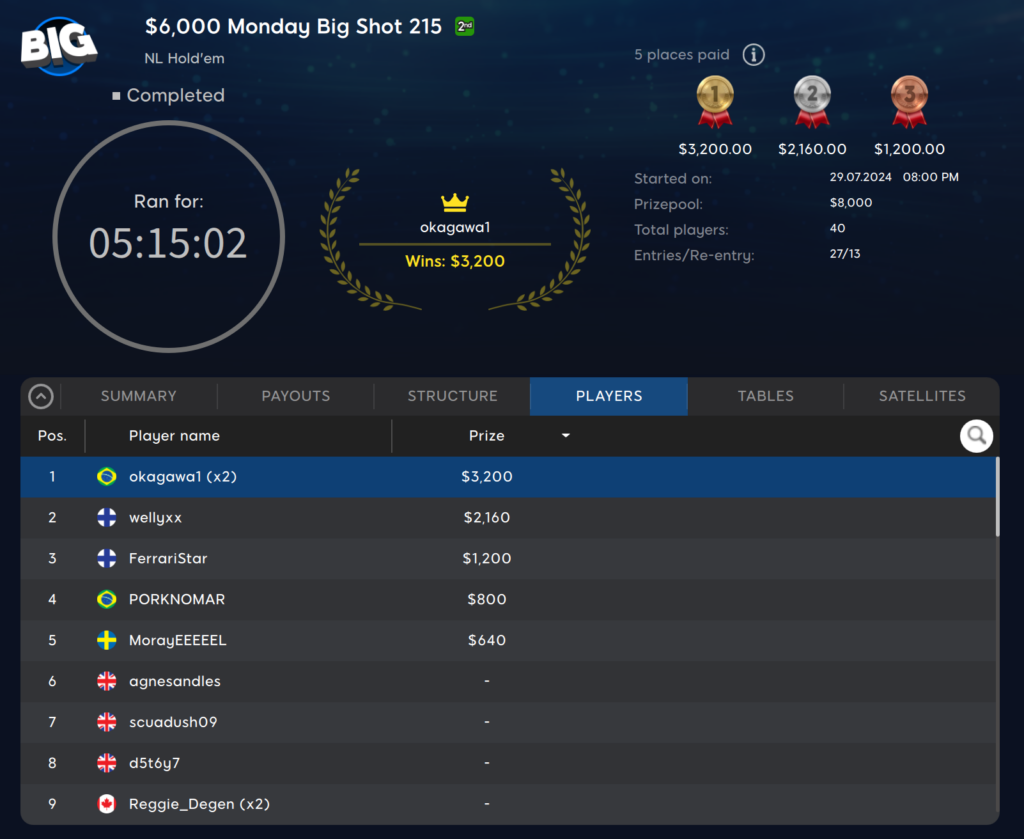 Das $215 Monday Big Shot war das größte Event gestern. Es bot eine $6.000 Garantie, die Dank der 40 Entries übertroffen werden konnte. Der $8.000 Preispool wurde auf die besten fünf Spieler aufgeteilt, allen voran ‚okagawa1‚ aus Brasilien. Dieser gewann $3.200 für seinen Sieg.