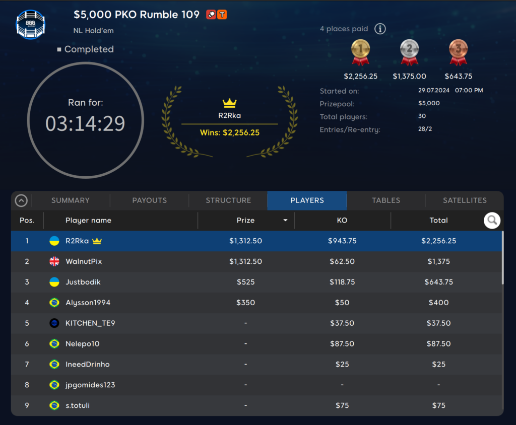 Da war zum Beispiel das $109 PKO Rumble mit einer $5.000 Garantie. Hier kamen 28 Spieler zusammen, die außerdem für zwei Re-entries bezahlten. Es reichte also nicht aus, um die Garantie zu erfüllen. Der Sieger des Events kam aus der Ukraine. ‚R2Rka‚ konnte $1.313 plus $943 an Bounties mit nach Hause nehmen.