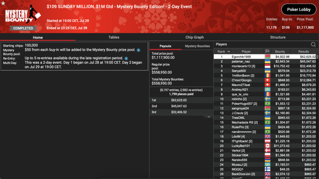 Und zu guter Letzt werfen wir ein Auge auf das gestrige Highlight. Das $109 Sunday Million Turnier mit Mystery Bounty-Aspekt spielte den Tag 2 und somit das Finale aus. Das Event hatte insgesamt 11.179 Entries und somit einen Preispool von $1.117.900. Auch hier ging der Sieg an einen Weißrussen. ‚Egorchik1995‚ sackte saftige $62.635 für den ersten Platz ein und erhielt zusätzlich $4.922 an Bounties. Die besten DACH-Platzierungen waren auf Platz 6 und 7 und kamen beide aus der Schweiz.
