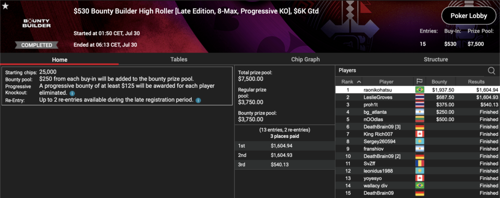 In der Late Edition des Turniers wurde eine $6.000 Garantie geboten und durch 15 Entries konnte auch diese übertroffen werden. Der $7.500 Preispool wurde auf die ersten drei Plätze verteilt und der Sieger ‚raonikohatsu‚ aus Brasilien erhielt den Top-Preis von $1.604 plus $1.937 an Bounties.