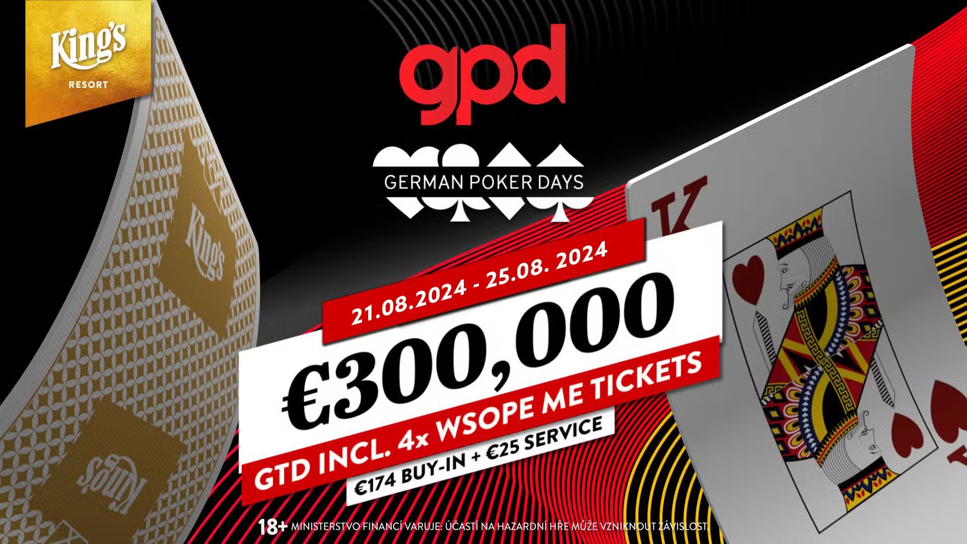 Vom 22.- 25. August 2024 findet im King’s Resort in Rozvadov das nächste €300.000 GTD German Poker Days Festival statt. Die GermanPokerDays (GPD) haben freundlicherweise ein Package für das Festival zur Verfügung gestellt, das ihr hier ganz einfach gewinnen könnt.
