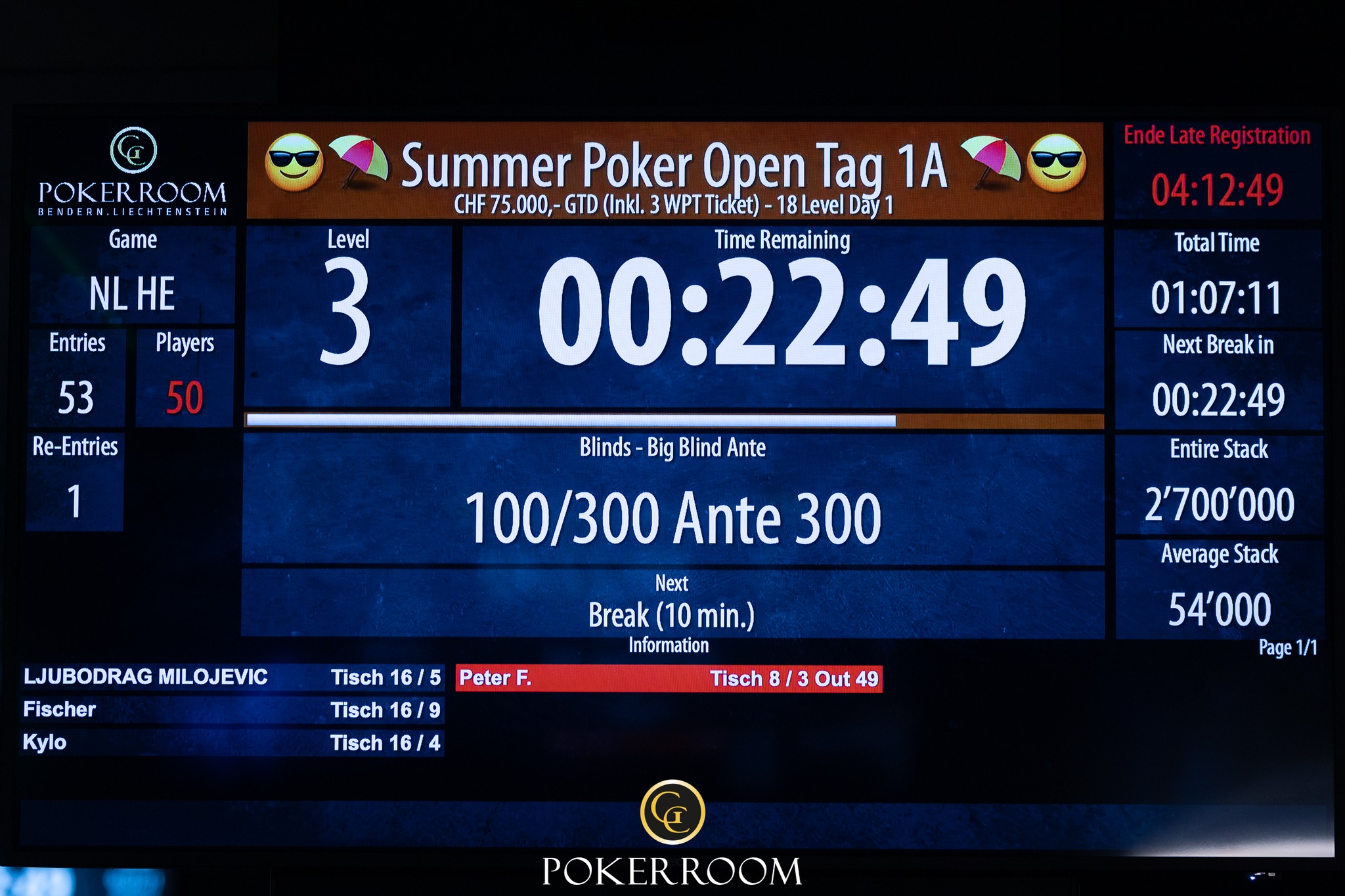 Heute geht es dann um 17:00 Uhr im Grand Casino Liechtenstein weiter mit dem Tag 1B des CHF 250 (220+30) Summer Poker Open Turniers. Gespielt wird auch hier mit 50.000 Start Stack und 30 Minuten Blind Levels.