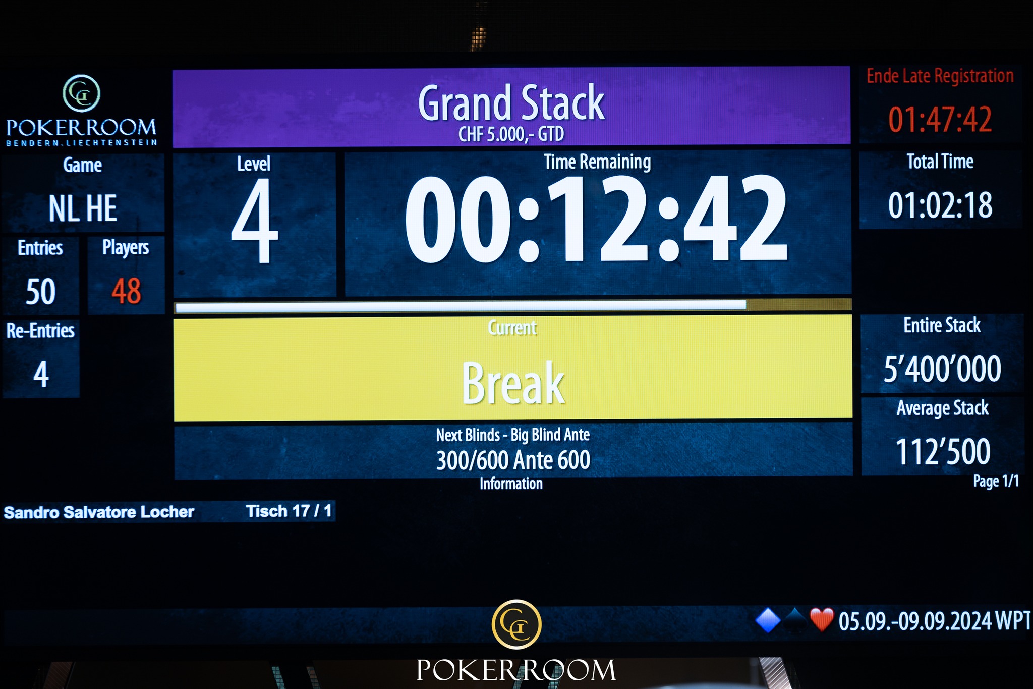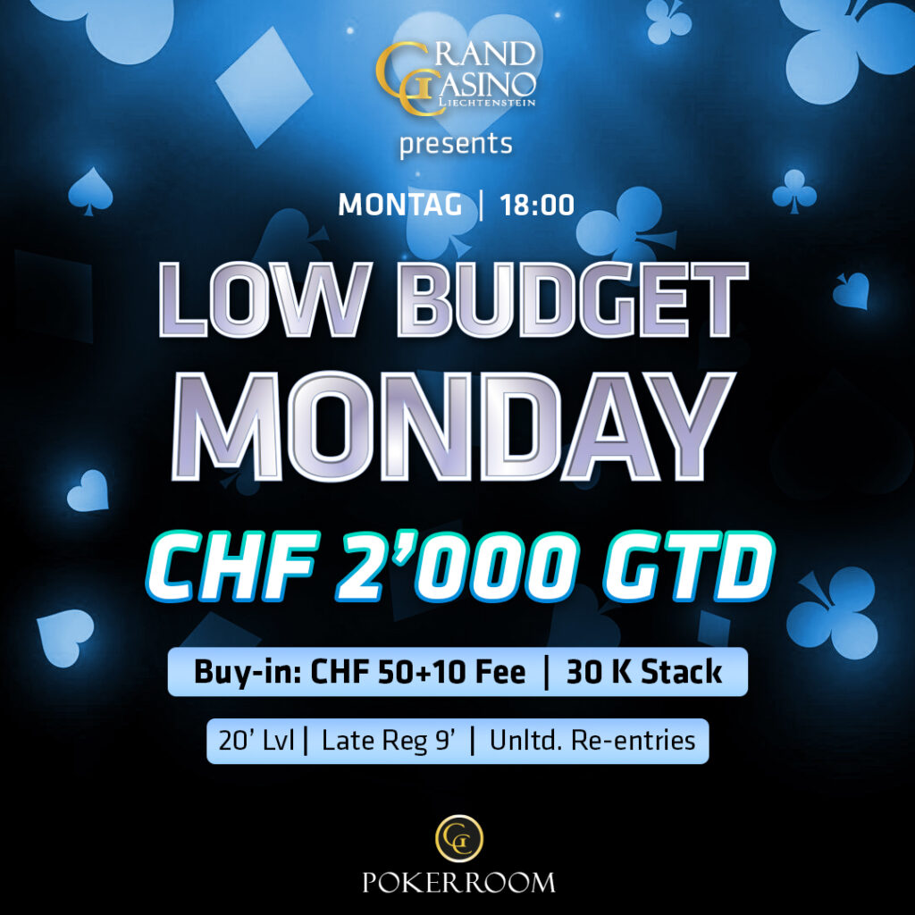 Heute geht es dann im Grand Casino Liechtenstein um 18:00 Uhr weiter mit dem CHF 60 (50+10) Low Budget Monday. Das Turnier hat eine CHF 2.000 Garantie und wird gespielt mit 30.000 Starting Stack und 20 Minuten Blind Levels.