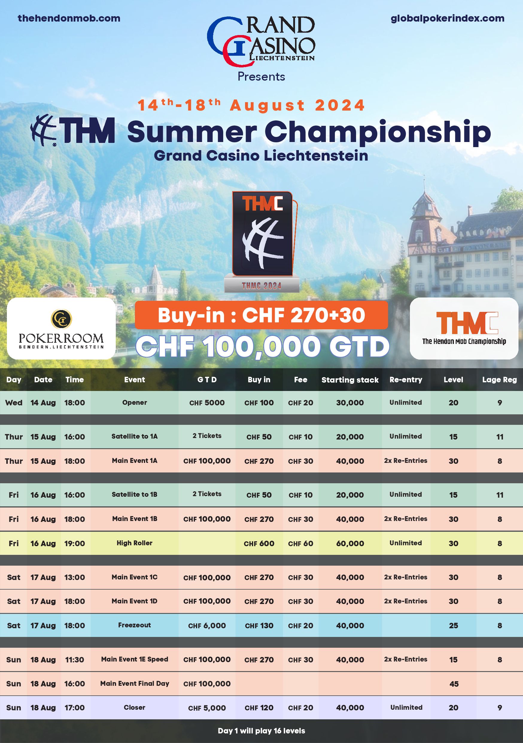 Am Freitag steht das CHF 600 THMSC High Roller auf dem Turnierplan, am Samstag folgt das CHF 130+20 THMSC Freezeout mit einer Garantie von CHF 6.000 und zum Abschluss gibt es dann am Sonntag noch das CHF 120+20 THMSC Closer mit einem Mindestpreisgeld von CHF 5.000.
