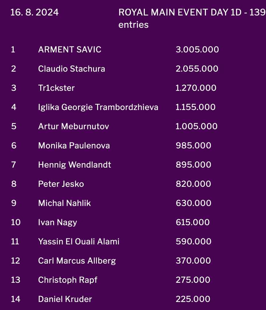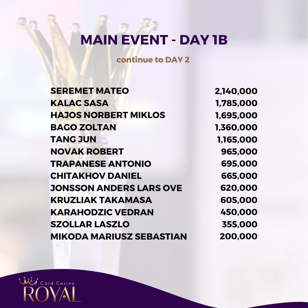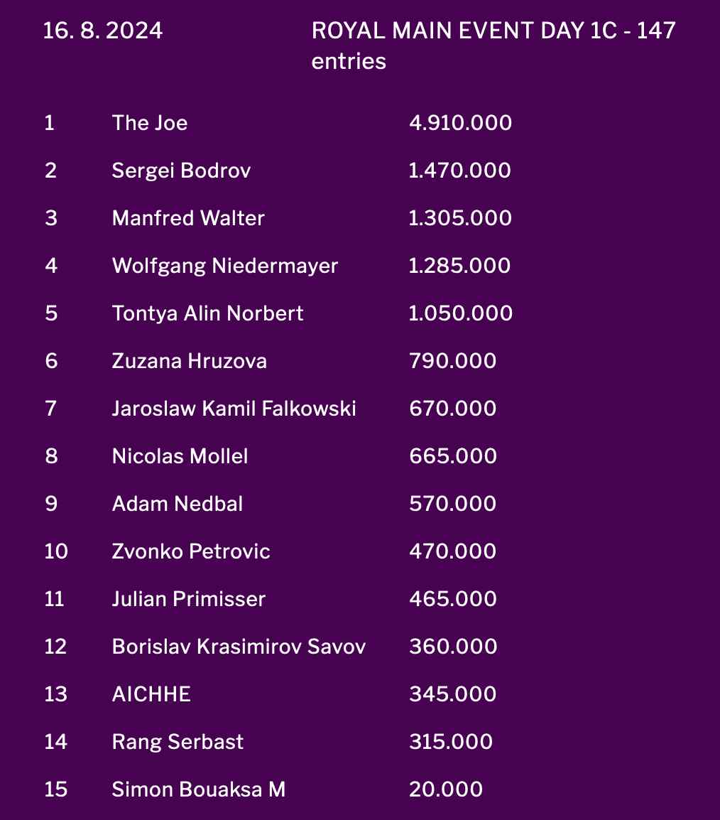 Dahinter sitzt Arment Savic mit 3 Mio. Chips, die er in Flight 1c erspielt hat. 56 Spieler haben sich bisher für Tag 2 qualifiziert.