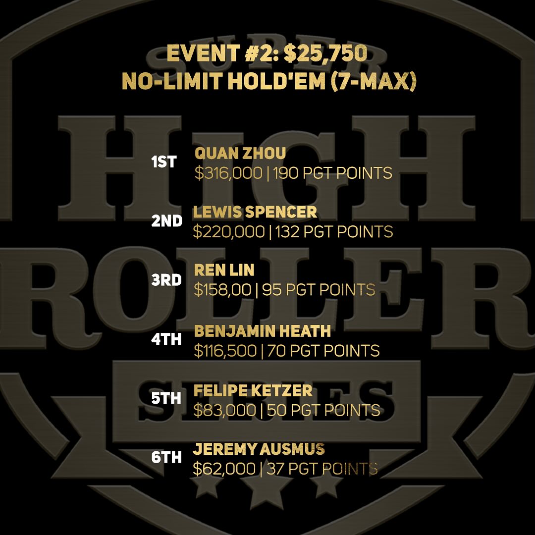 Entschieden wurde Event #2, ein $25.750 NLH 7-Max, bei dem sieben Spieler das Finale erreicht hatten und um ein Preisgeld von $995.500 spielten.