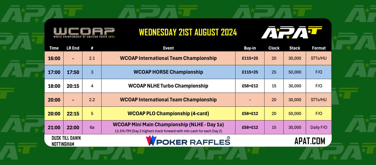 Am Mittwoch gibt es ab 15:45 Uhr live aus dem Dusk Till Dawn Pokerroom in Nottingham den Livestream vom Round 2 (Sit & Go) der APAT / WCOAP 2024. Das Team Germany wurde in Kooperation mit dem Grand Casino Aš aufgestellte.