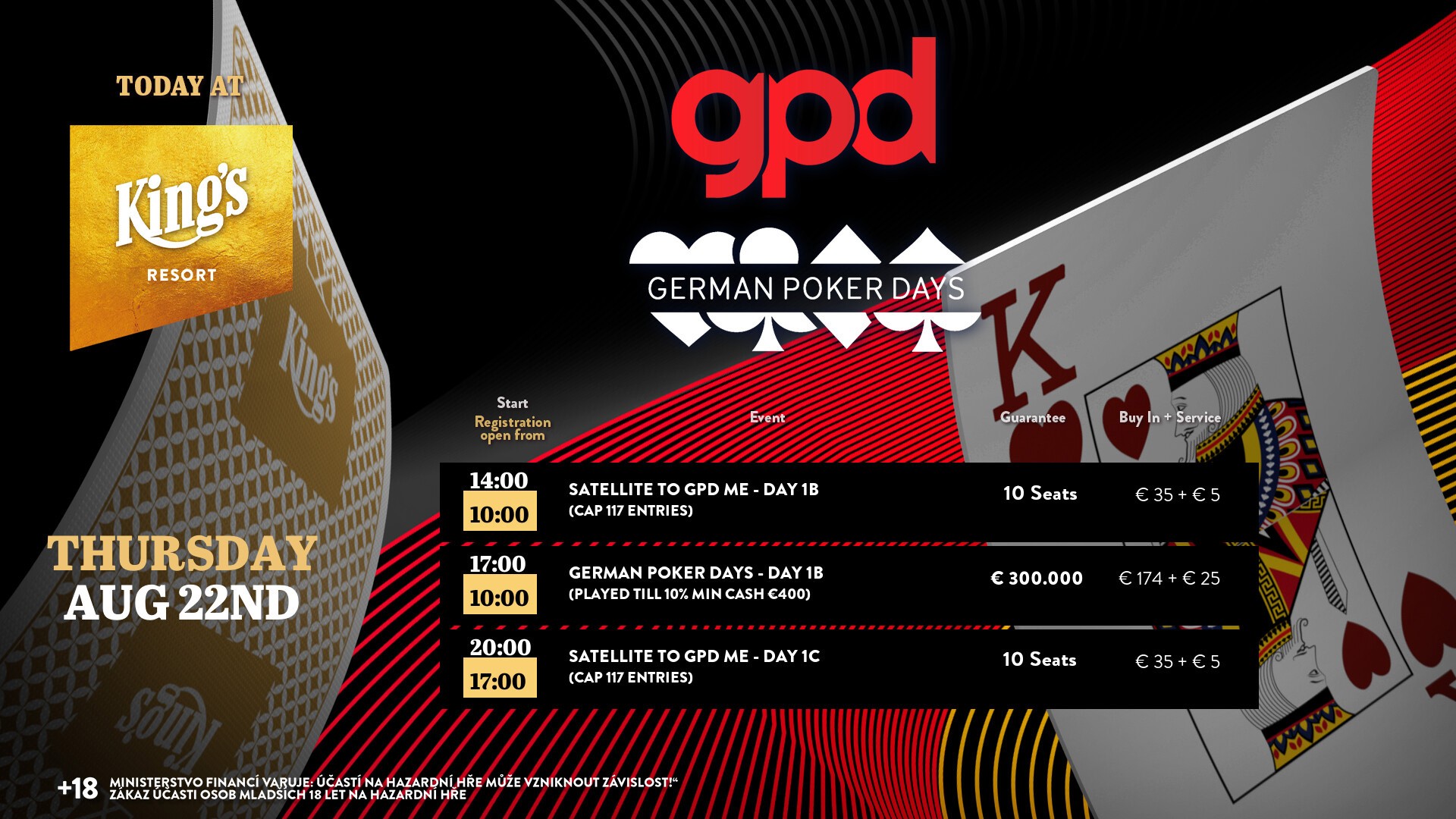 Im King’s Resort Rozvadov geht es heute um 17 Uhr mit Tag 1B des €174+25 German Poker Days Main Event weiter. Um 14 Uhr bzw. 20 Uhr kann man sich jeweils für €35+5 bei Satellites eines von zehn garantierten Tickets für Tag 1B bzw. 1C sichern.