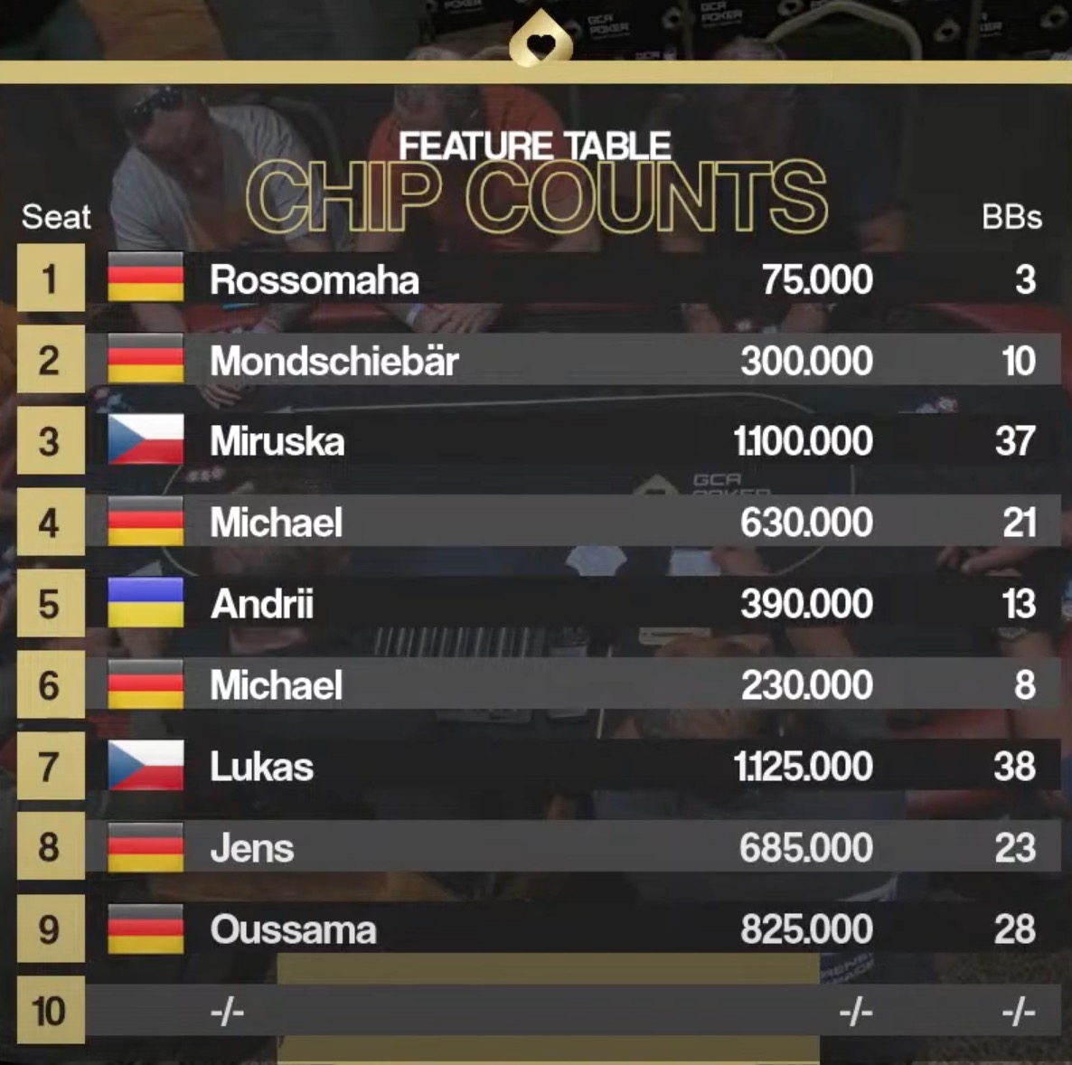 Zu Beginn des Final Tables, der um 02:03 Uhr startete, waren die beiden Locals Lukas und „Miruska“ als einzige Chipmillionäre bereits in Führung. Den Finaltisch erreichten insgesamt 5 Deutsche. Allerdings schieden direkt 4 von ihnen als erste am Final Table aus: „Mondschiebär“ wurde 9. (€250), Jens Schwering finishte auf der 8 (€325), „Maikel“ schied auf Rang 7 (€400) aus und 6. (€500) wurde Michael Hahn. Damit lagen die Hoffnungen der D-A-CH-Community allein auf „Rossomaha“. Der Deutsche schaffte es aufs „Treppchen“. Als 3. konnte er sich in dem €80-Turnier am Ende €1.200 Payout sichern. Das Heads-Up war dann ein rein tschechisches. Der GCA-Dauercasher Lukas Rychetsky wurde am Samstag Runner-Up (€1.825) und musste diesmal seiner Landsfrau „Miruska“ den Titel und (ohne Deal) die Siegprämie von €2.800 überlassen.