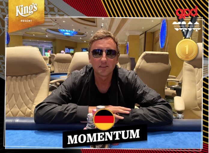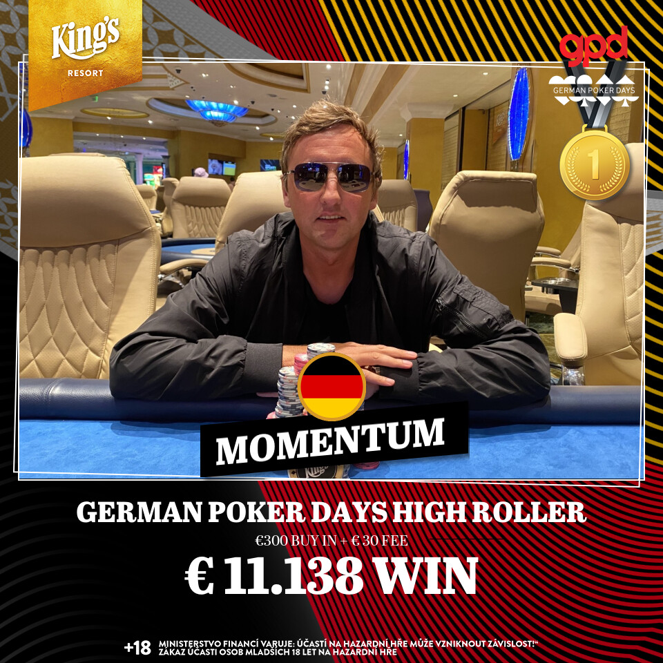 Unter den 17 ITM-Finisher*innen waren auch 8 aus Deutschland. 5 von ihnen sollten es an den Finaltisch schaffen. Dort konnten Andreas Simml asl 9. (€1.107), „Triple 7“ als 8. (€1.483) und Charlott Eisenkolb als 5. (€3.267) cashen. Als mit dem Israeli „chiKKita banAAna“ einer der erfolgreichsten King’s Grinder auf Platz 3 (€4.892) ausgeschieden war, kam es zu einem deutschen Heads-Up. Darin finishte der erfahrene Dauercasher Jürgen Fittschen als Runner-Up (€7.527). Der Sieg ging an seinen Landsmann „Momentum“, der ebendieses bis zum Schluss nutzen konnte, um ganz ohne Deal €11.138 Siegprämie aus dem German Poker Days High Roller mitzunehmen.
