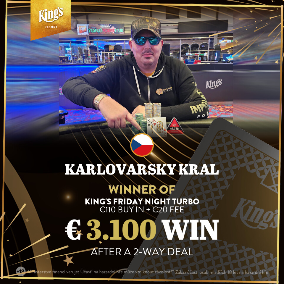 Der €13.752 Preispool wurde auf 15 Spieler verteilt und der Sieger mit dem Spitznamen ‚Karlovarský Král‘ konnte nach einem Heads-up Deal mit ‚Jagu27‘ das Turnier für sich entscheiden. Der Tscheche nahm €3.100 dafür mit nach Hause.