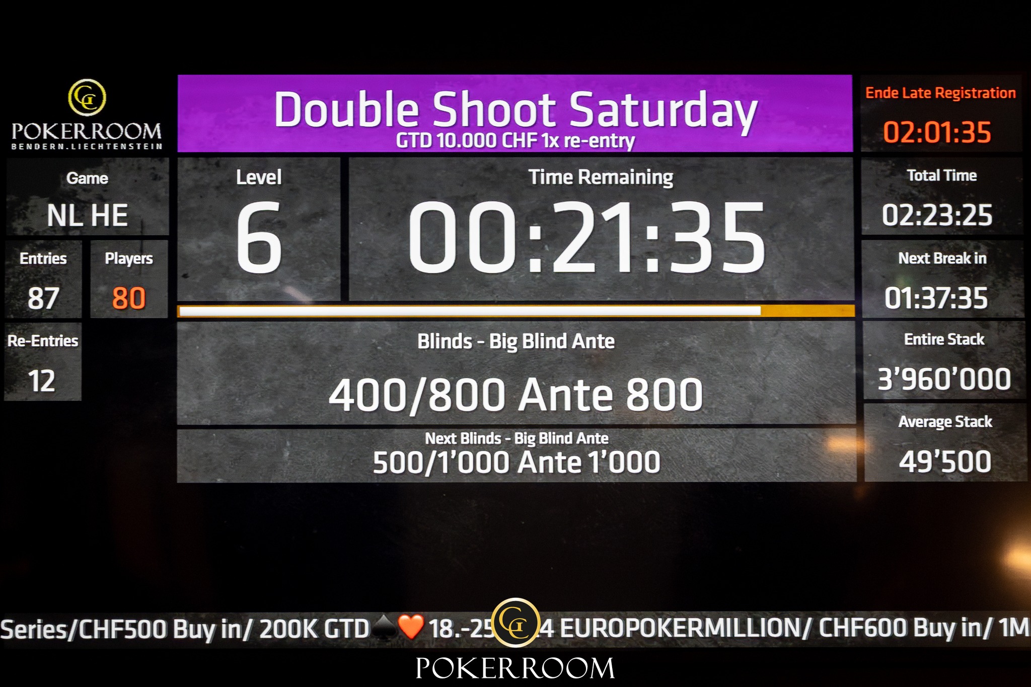 Beim Double Shoot Saturday ging es mit 40.000 in Chips los und jeder Level dauerte 25 Minuten. Bis zum Ende der Late-Registration nach Level 9 stürmten 94 Poker-Cracks den GC Pokerroom und mit zusätzlichen 34 Re-Entries wurde die Garantiesumme mehr als verdoppelt. Am Ende lagen CHF 23.040 im Preispool und 15 Akteure sollten es in die Geldränge schaffen. Der Min-Cash schlug mit CHF 390 zu Buche und für den Champion waren CHF 5.930 reserviert.