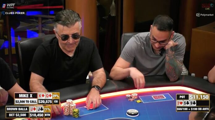 Auf einem Board mit 952 spielte Eshan Bhalla nach seiner 4-Bet vor dem Flop mit Pocket Jacks $2.500 an, worauf Mike X mit KQ und effektiven $12.950 All-In ging.