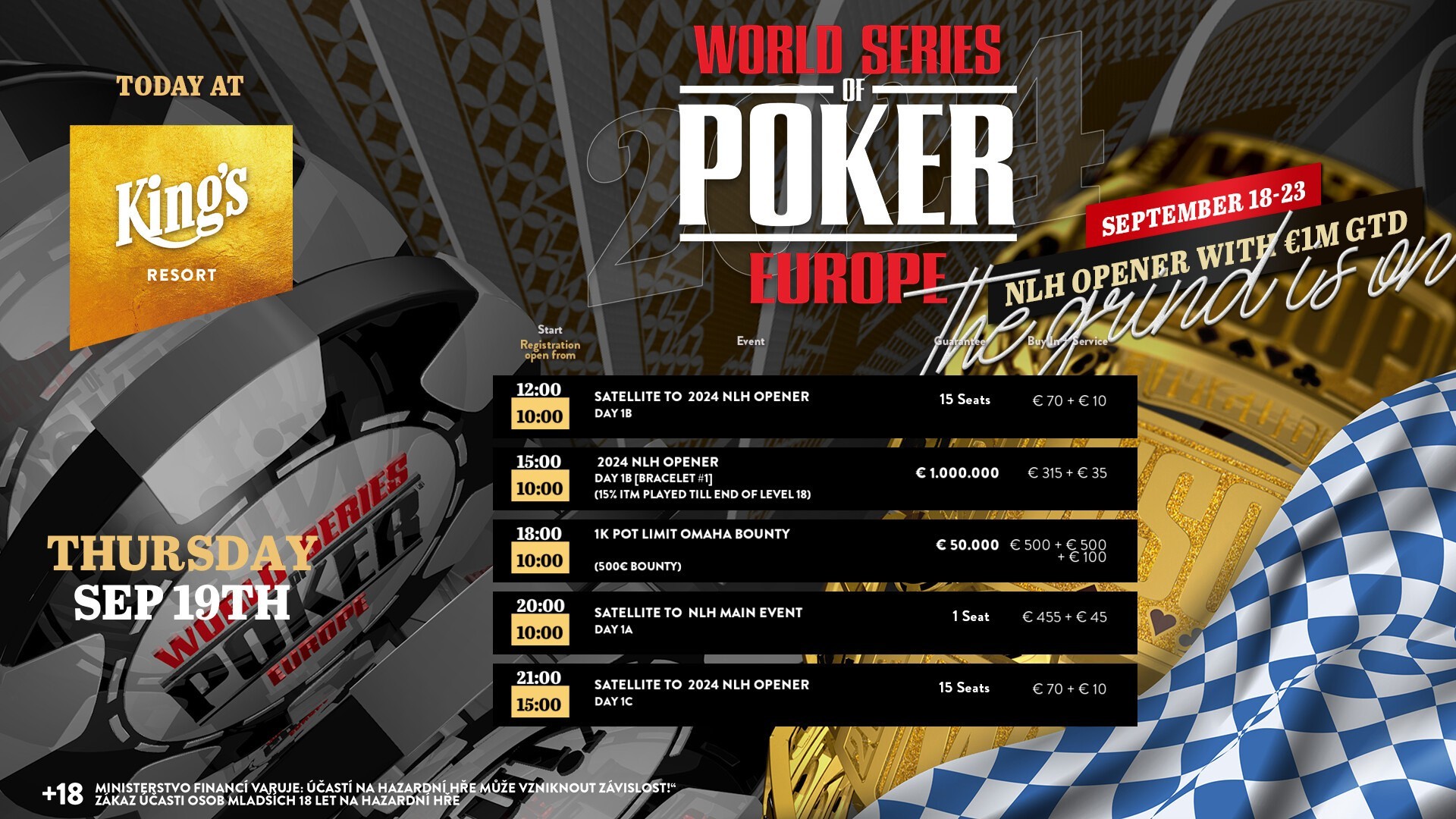 Heute werden im King’s Resort wieder insgesamt drei Satellites – davon zwei für den WSOPE NLH Opener und eins für Tag 1A des WSOPE Main Event – angeboten. Außerdem steht um 15 Uhr Tag 1B des WSOPE NLH Opener auf dem Programm und um 18 Uhr gibt es das €500+500+100 PLO Bounty.
