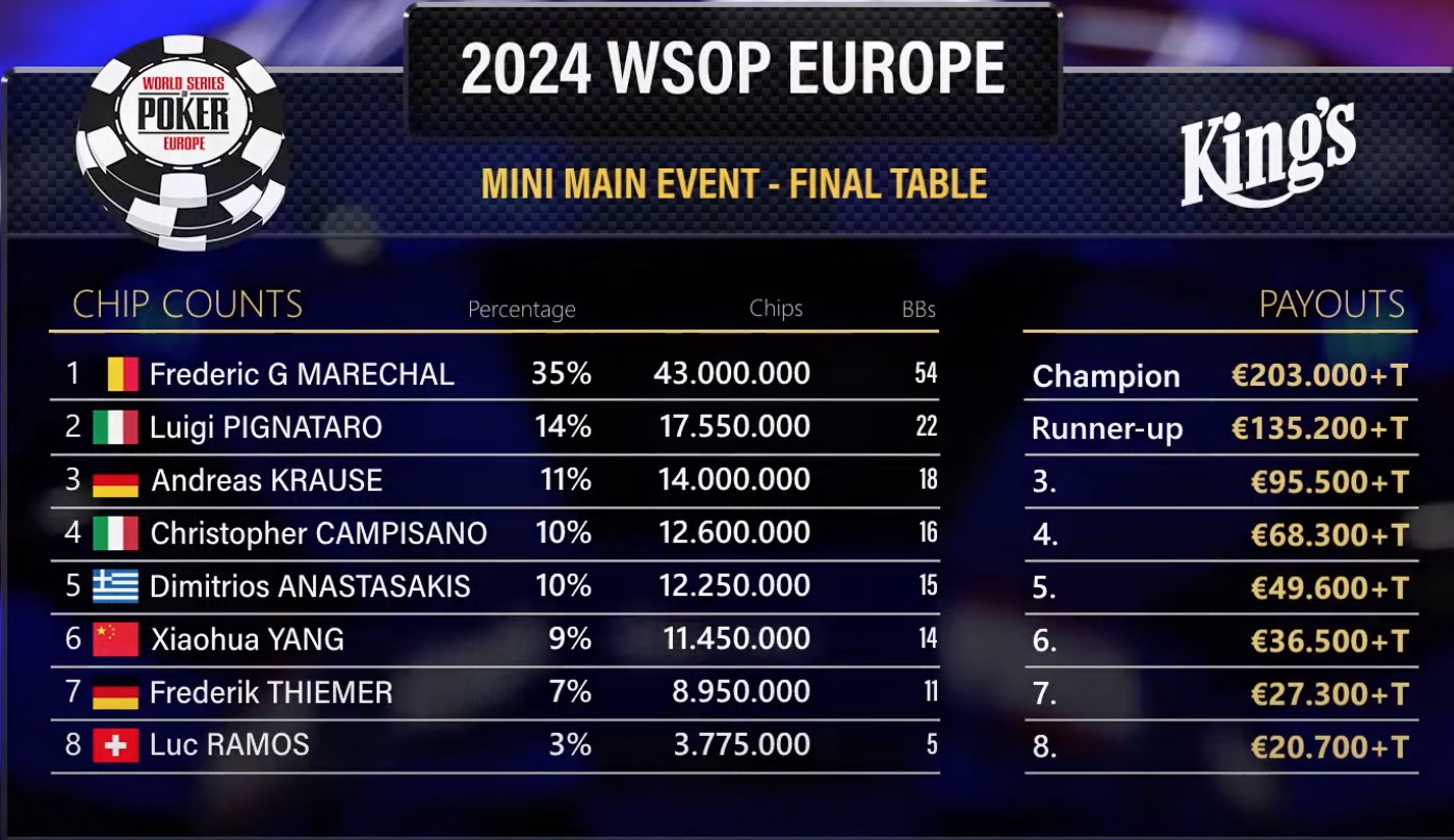 Am letzten Tag des 4-Day Mini Main Events mit €1.200+€150 Buy-In kamen die letzten acht von ursprünglich 1.286 Spieler*innen am Finaltisch zusammen, der vor den Augen der Zuschauer auf YouTube, Twitch und natürlich den Railbirds vor Ort im King’s Resort Rozvadov ausgetragen wurde. Allen Finalisten war jeweils ein Payout von €31.050 sicher, wovon €10.350 ein Ticket für das WSOP Europe Main Event war. Für den Sieg sollte es jedoch ein Vielfaches, nämlich €213.350 aus dem €1.450.608 schweren Preispool geben. Als Monsterchipleader ging der Belgier Frederic Marechal mit 86 BBs ins Finale, vor Luigi Pignatatoro aus Italien mit 35 BBs und dem Pokereuropameister von 1999, Andreas Krause aus Deutschland (28 BBs). Sein Landsmann Frederik Thiemer hielt 18 BBs und lag damit auf Rang 7 im Chipcount, das Schlusslicht des Zwischentableaus vor Beginn des Final Tables bildete der Schweizer Luc Ramos mit 8 BBs.