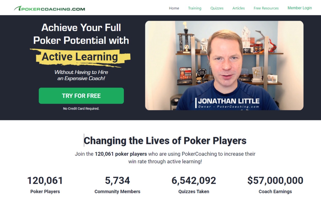 Über 120.000 Spieler haben bereits die Pokerschule PokerCoaching.com besucht, um ihre BB/100 Winrate zu erhöhen. Dabei umfasst die Palette der Pokerinhalte und der Lehrmethoden eine große Bandbreite: Dazu gehören Live Webinars, Quizzes, oder Study Sessions von den Top Coaches, die selber bereits über $57.000.000 Winnings einfahren konnten. Dazu zählt natürlich auch Jonathan Little, der sowohl Masterclass Kurse für Turniere, und auch für Cash Games, als auch grundlegende Kurse auf seiner Plattform anbietet.