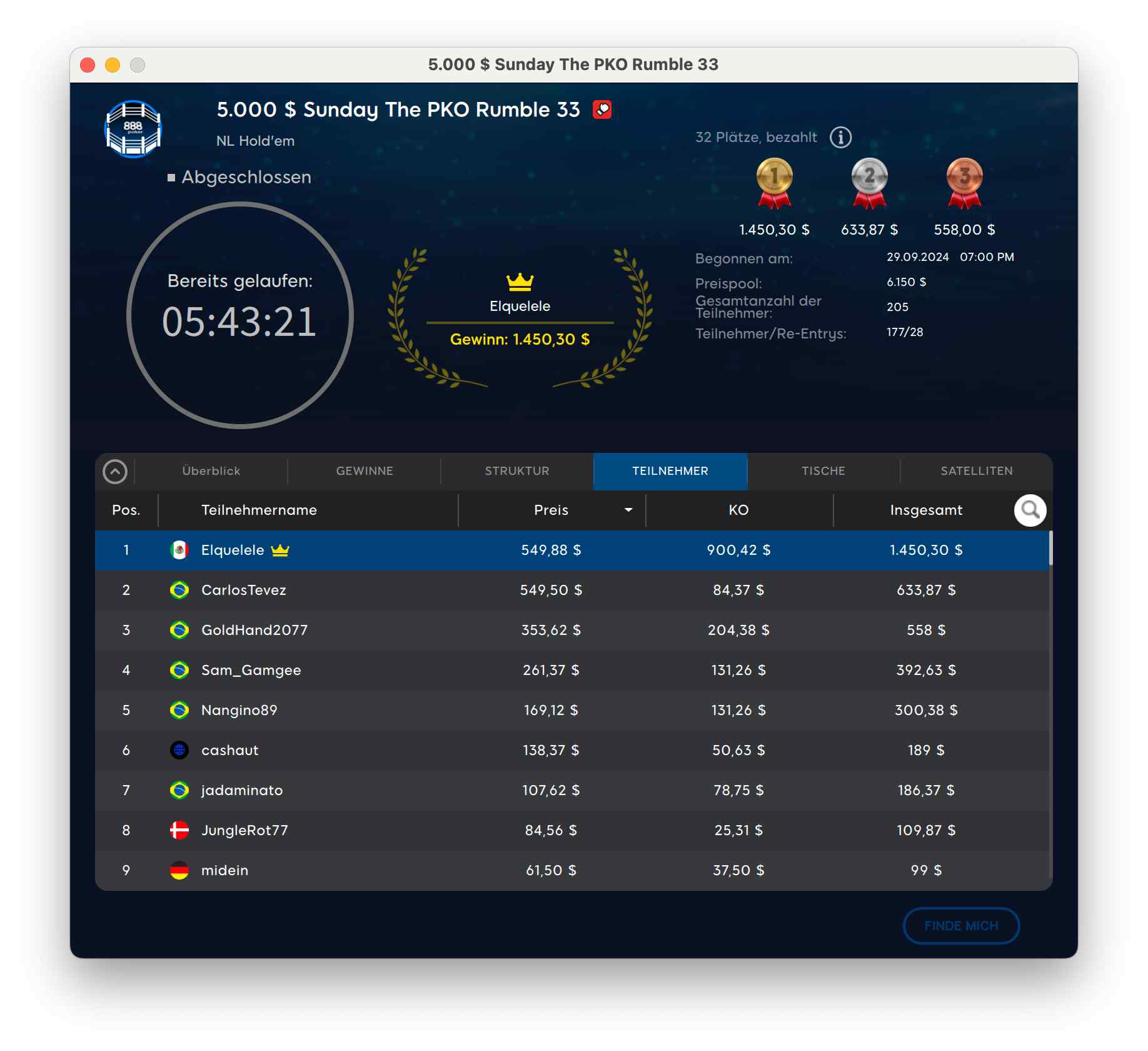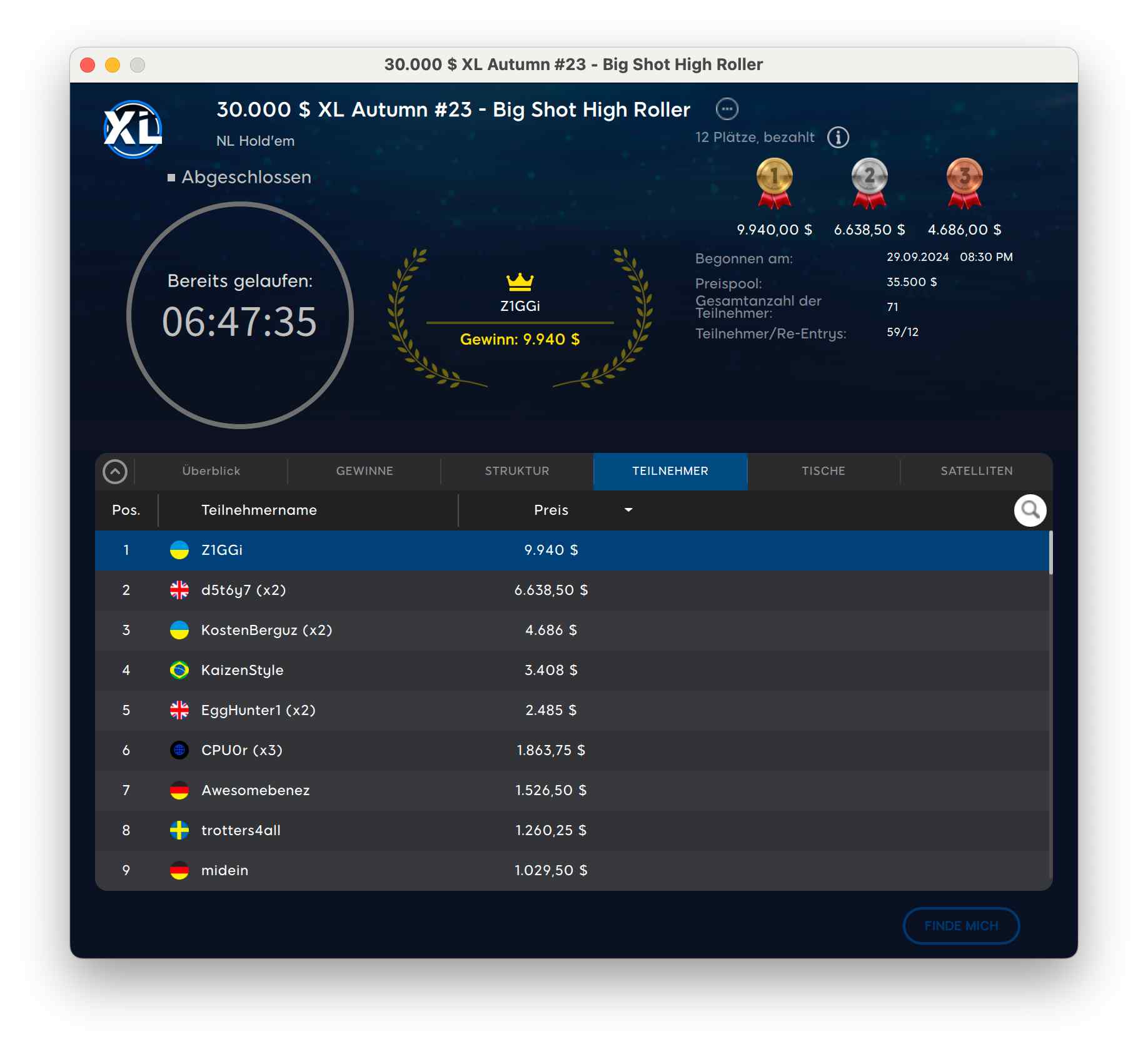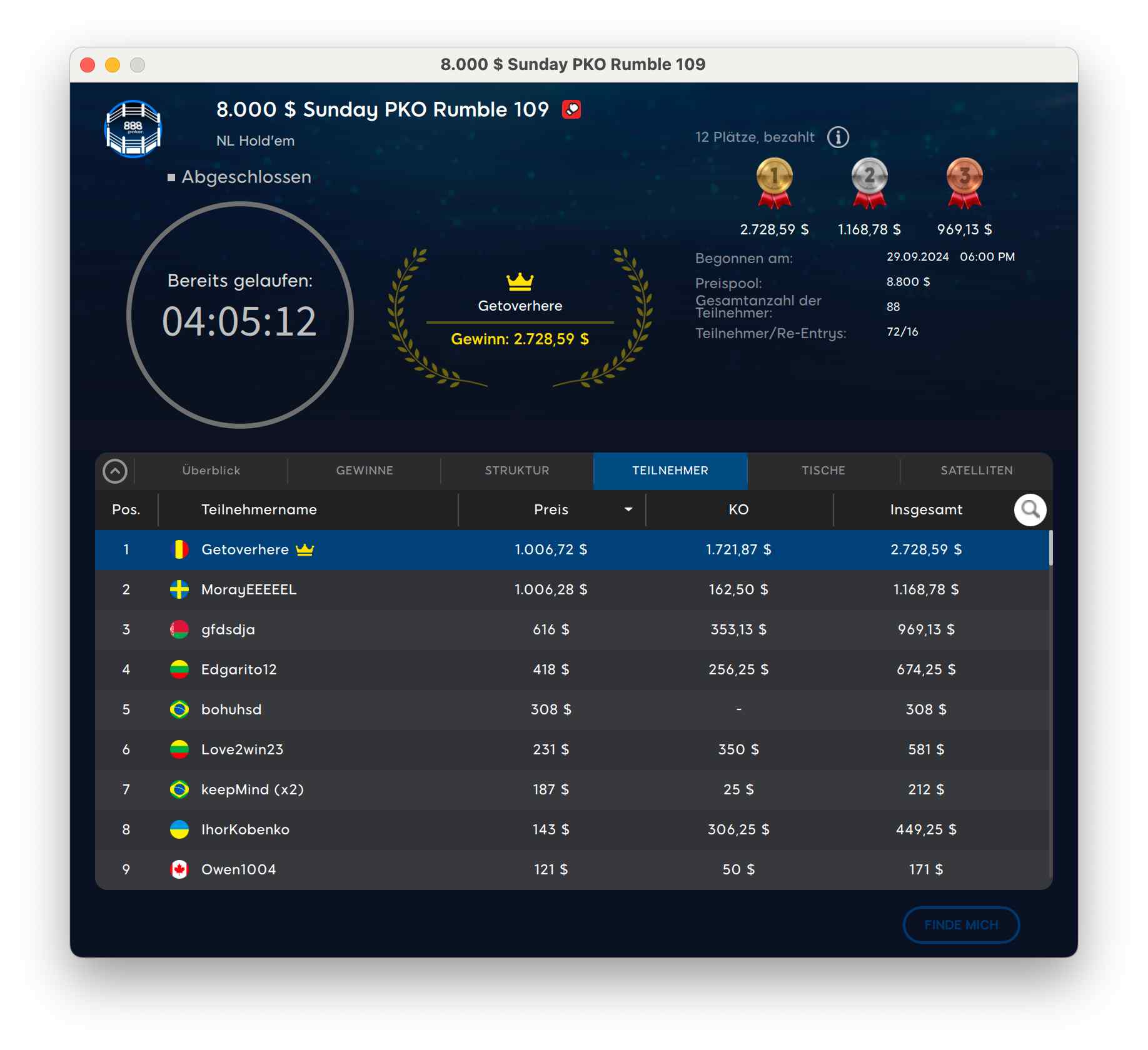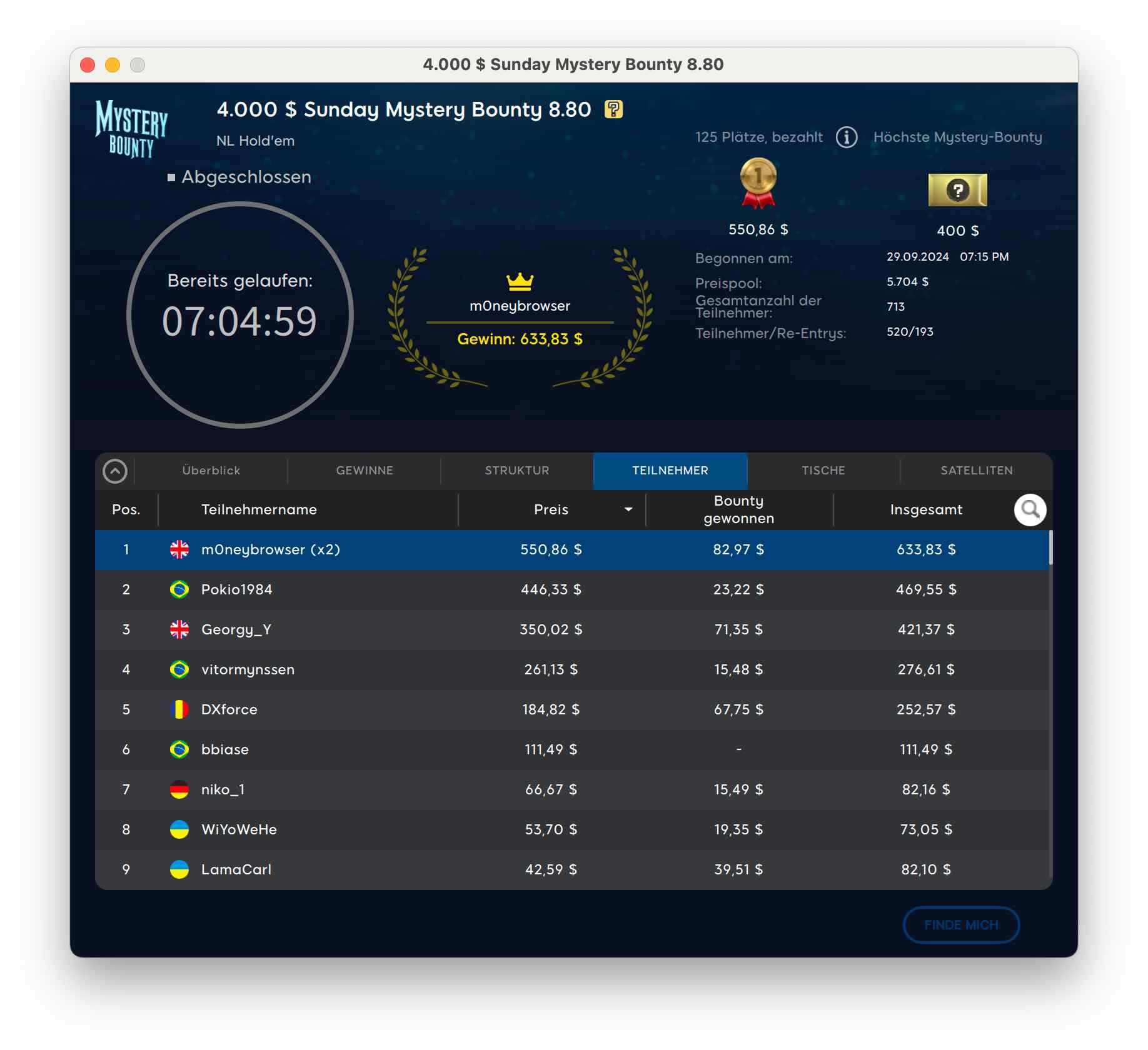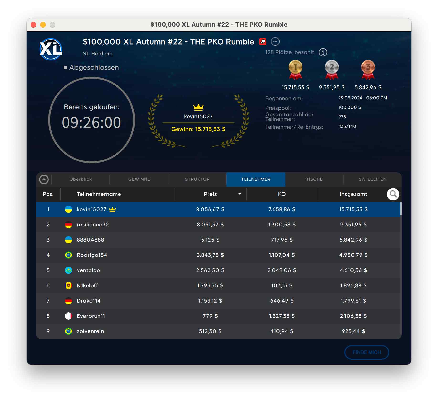 Der Sieg ging in die Ukraine an „kevin15027“ für $8.056 + $7.658. Runner-Up wurde der deutsche Spieler „resilience32“ für $8.056 + $1.300.