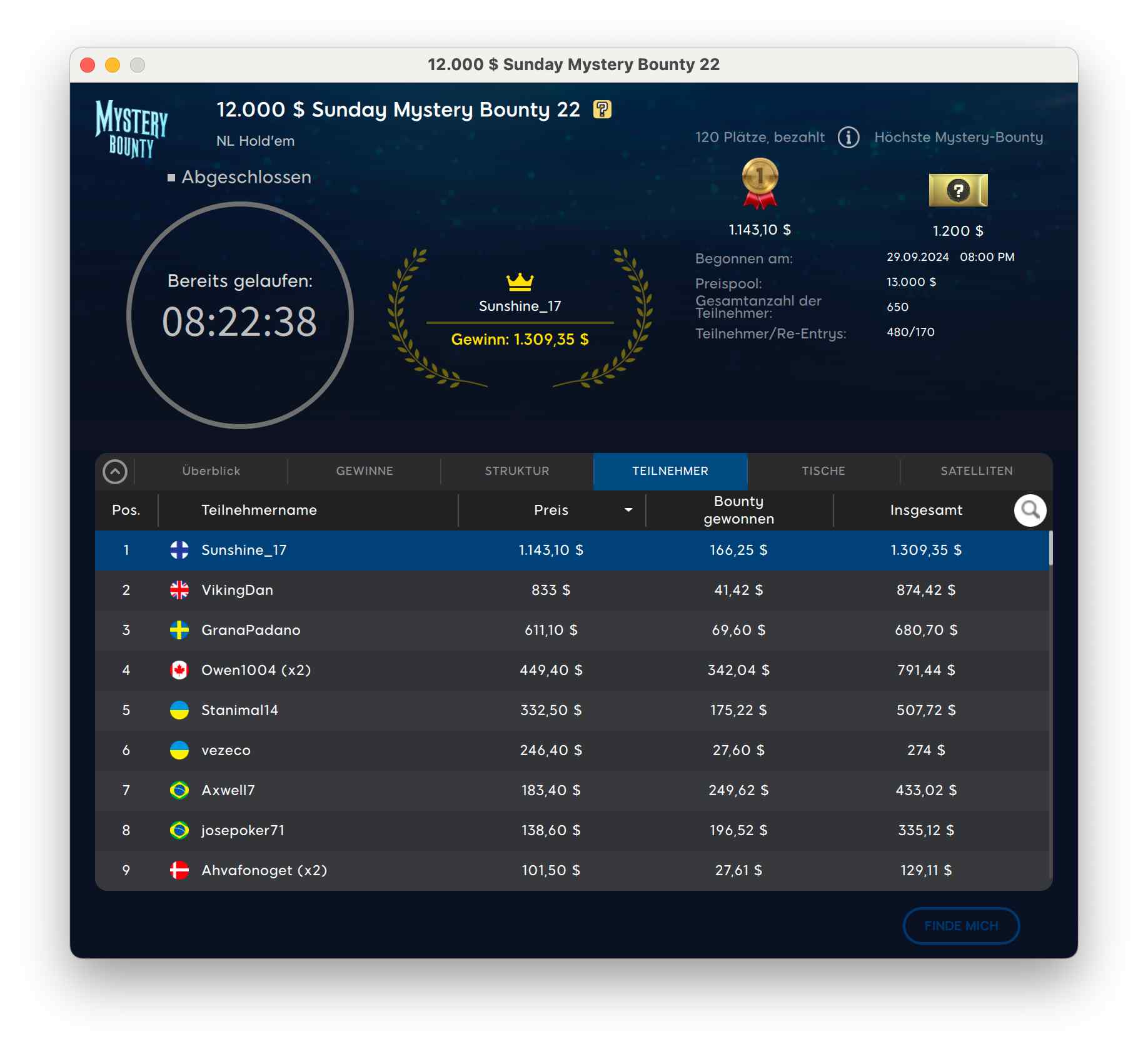 Ein deutschen Sieg gab es beim $16,50 XL Autumn Mystery Bounty. 1.006 Spieler versuchten sich, 412 Re-Entries wurden gezogen. $21.270 gab es im Preispool.