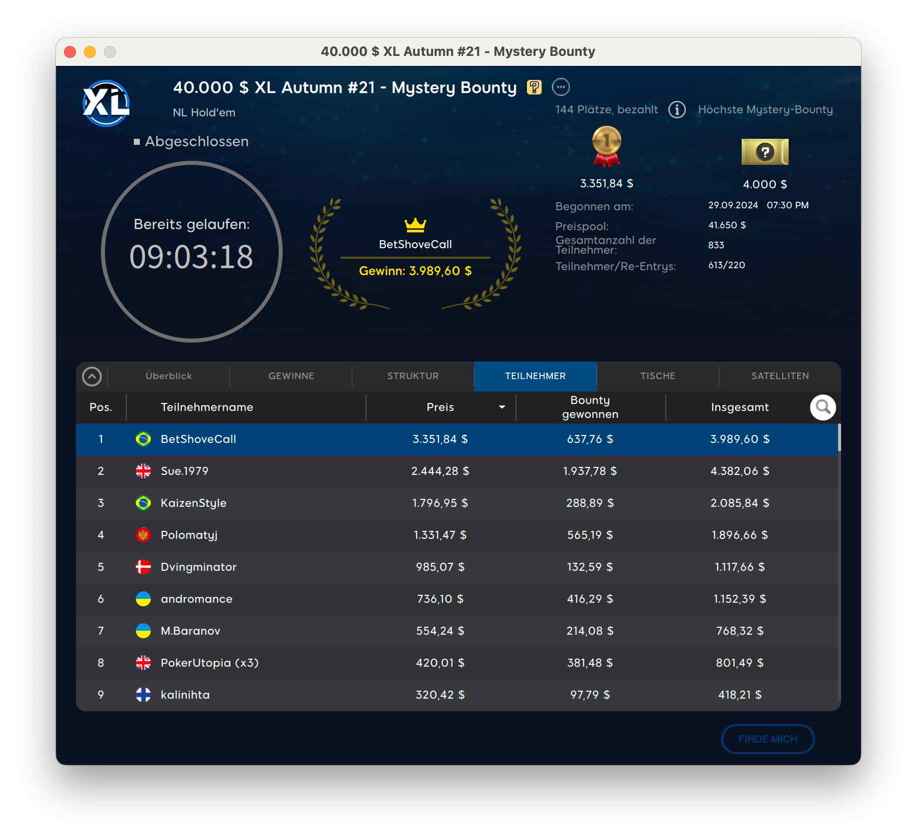 Das $55 XL Autumn Mystery Bounty hat 613 Teilnehmer, 220 Re-Entries wurden hier gezogen. $41.650 kamen dadurch im Pott zusammen. Der Sieg ging an „BetShoveCall“ aus Brasilien für $3.351 + $637.