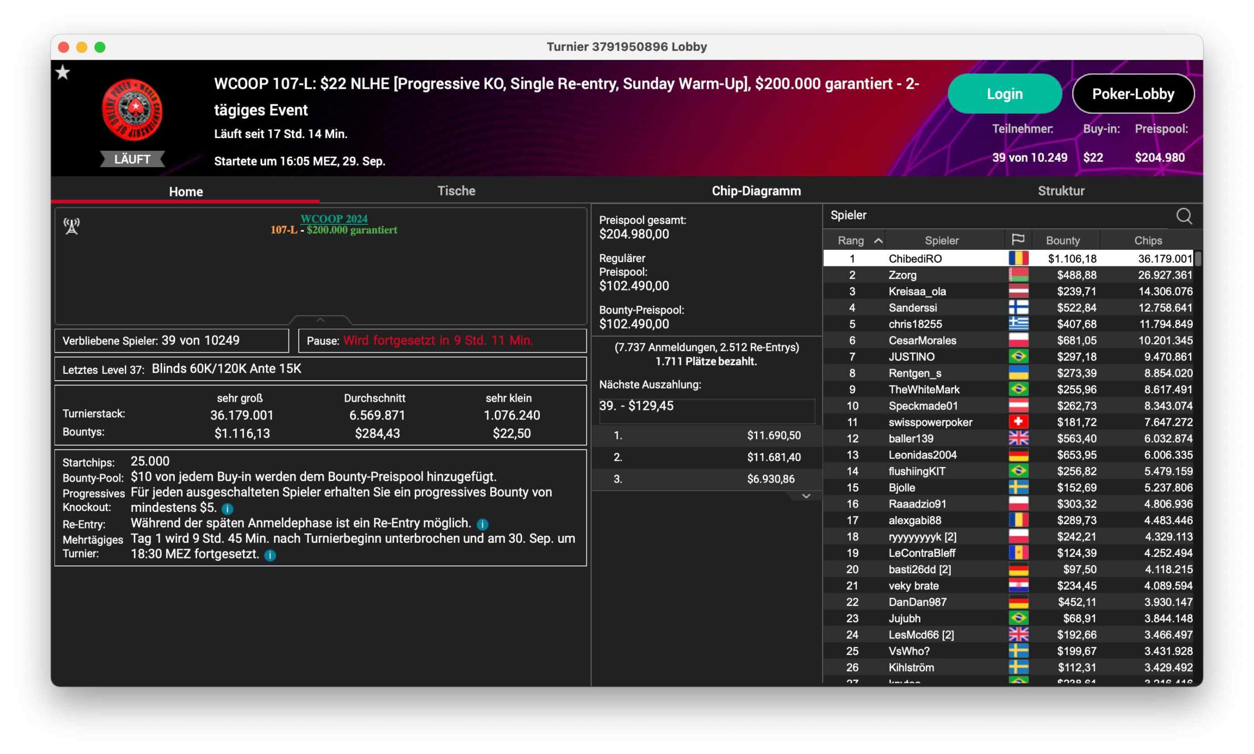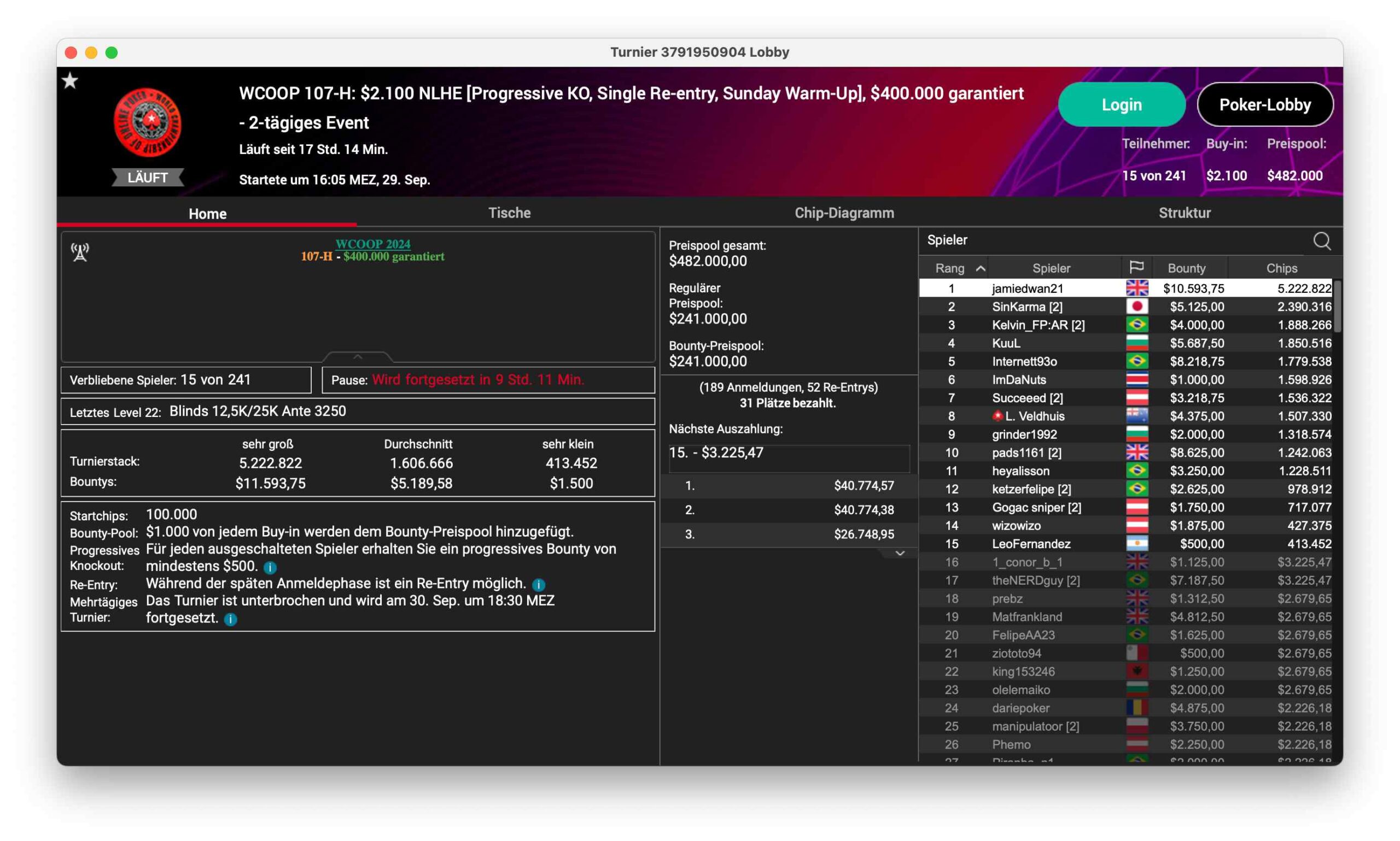 Ansonsten gab es viele Turnierstarts am Sonntag. Das $10.300 WCOOP Main Event hat immer noch eine offene Registration. 436 Entries sind bereits dabei, $5 Mio. sind garantiert. Es führt Boris „b.a.angelov“ Angelov mit 2,27 Mio. Chips, Leon „RUMUKULUS“ Sturm sitzt mit 1,94 Mio. Chips dahinter. „Kurfürst“ aus Österreich auf Platz 3 mit 1,93 Mio. Chips knapp dahinter.