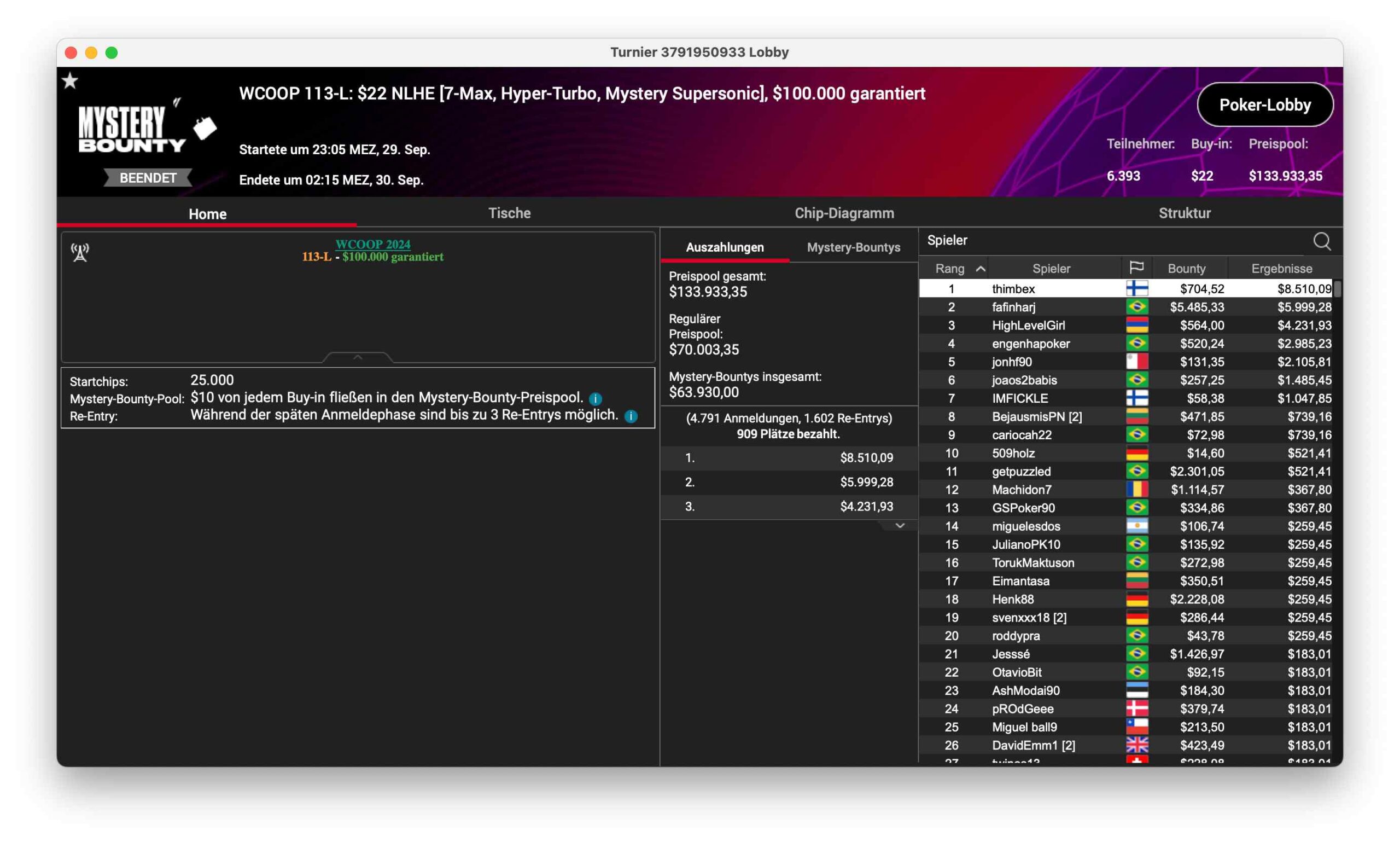 Es gab zwei Siege aus DACH-Ländern. „jzzca“ aus Deutschland gewann das $109 NLHE PKO Womens Event für $1.851 + $1.491. 137 Entries hatte das Turnier – $15.000 wurden aus der Garantie ausgespielt.