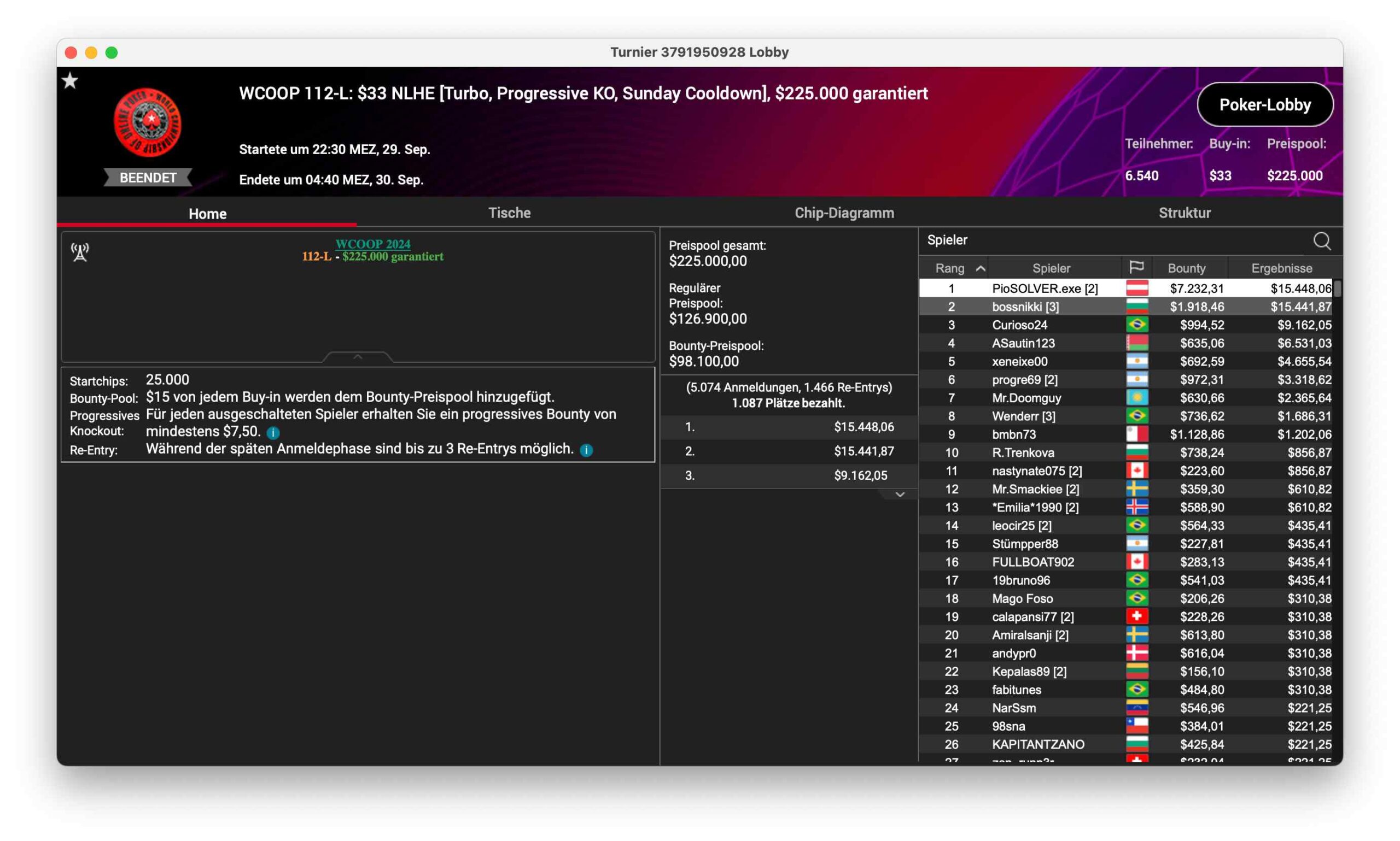 Das $33 NLHE Turbo PKO hatte 6.540 Entries und $225.000 Preispool aus der Garantie – es gab ein kleines Overlay für die Spielerschaft. „PioSolver.exe“ aus Österreich holte den Sieg mit seiner zweiten Bullet für $7.232 + $15.448.