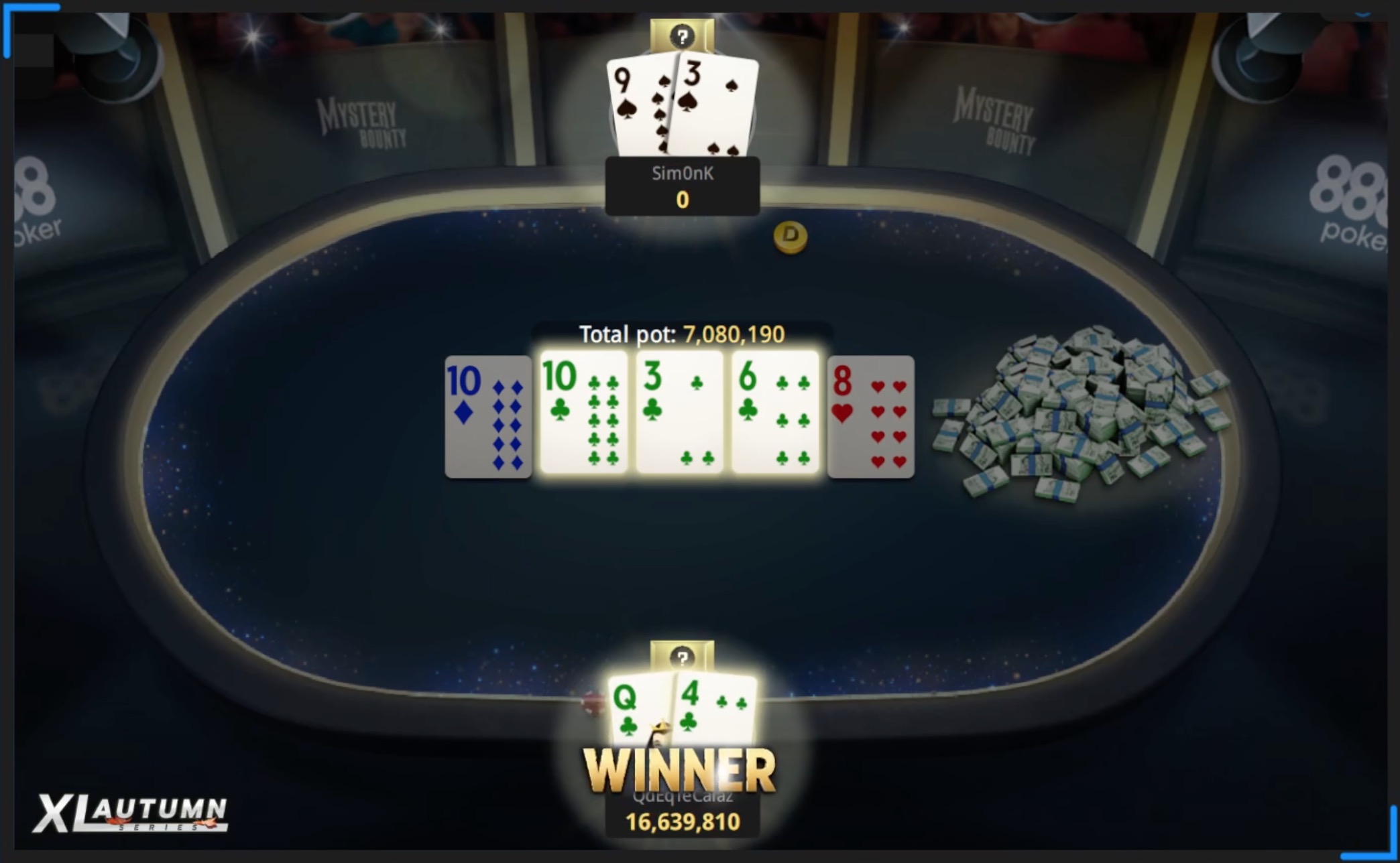 Damit gingen unter den Augen der Twitch-Zuschauer, kommentiert von Nick Wealthall und David Tuchmann, kombinierte $38.282 an Runner-Up „Sim0nK“. Die virtuelle Krone, samt Bragging Rights für den XL Autumn Series Main Event Sieg und nicht zuletzt insgesamt $45.264 landeten dagegen bei „QdEqTeCalaz“.