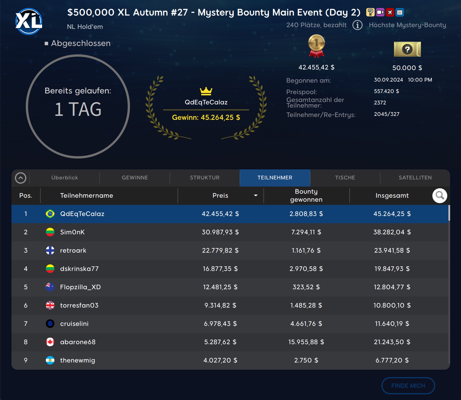 Nach dem Ausscheiden des Deutschen „HSV_Gandi“ (10. Platz, $5.297) war der Finaltisch an Tag 2 gefunden. Eigentlich hätte der Spieltag da zuende sein können, doch noch ein weiterer Spieler sollte am Montag gehen, ehe das Turnier bis zum Dienstag unterbrochen wurde. Die letzten 9 von ursprünglich 2.372 (2.045+327) Entrys hatten jeweils $4.027 bereits sicher, als Siegprämie sollten jedoch $42.455 warten, natürlich zuzüglich aller eingesammelten Bountys! Und die konnten sich in dem Mystery Bounty Main Event mit $235+$15 Buy-In sehen lassen: Die Top-Bounty sollte unglaubliche $50.000 umfassen, mehr als das Preisgeld für Platz 1!