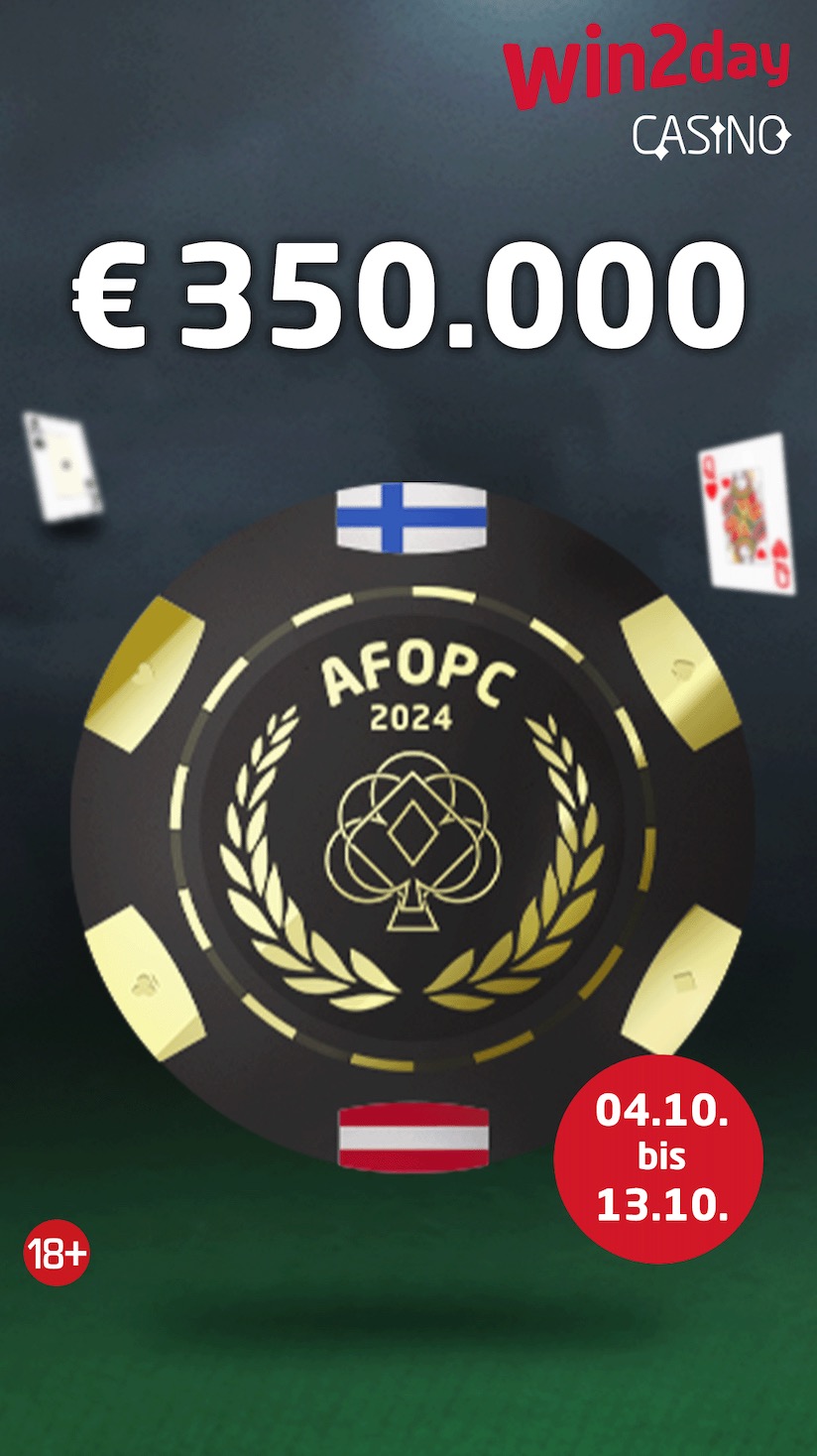 Vom 4. bis 10. Oktober ist es wieder so weit, die Austrian & Finnish Online Poker Championship (AFOPC) steht vor der Tür! Das Jahreshighlight unter den Online Poker Festivals auf win2day findet mit 38 Events plus2 Freerolls mit jeweils €5k Preispool und insgesamt €350.000 an Festival Garantien auf dem österreichischen Online Poker Client statt.
