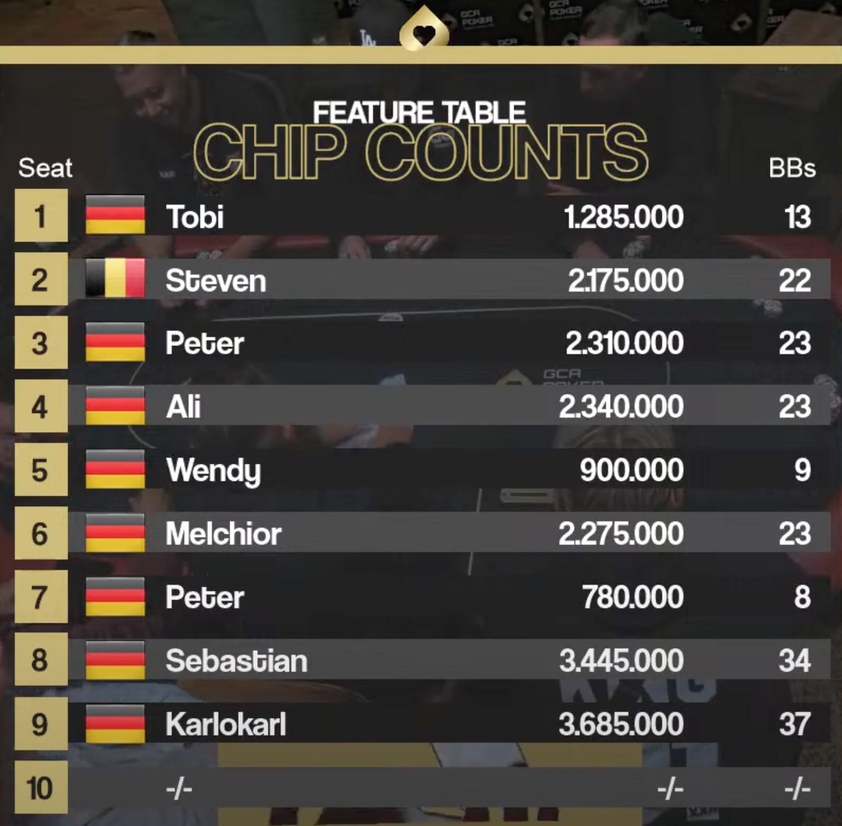 Am Final Table, der wie der Großteil des Spieltages auf den Youtube- und Twitchkanälen von „gca_poker“ gestreamt wurde, war Tobias Tropschuh (9., €504) der erste Seat Open. Ihm folgte der GCA-Stammgast „Wendy“ (8., €635), gefolgt von „Peter“ (7., €806) und Waldemar Rudin (6., €1.008). Fünfter wurde Sebastian Fleischmann (€1.239), auf Rang 4 finishte Melchior Herbig (€1.663), womit die drei Medailliengewinner feststanden.