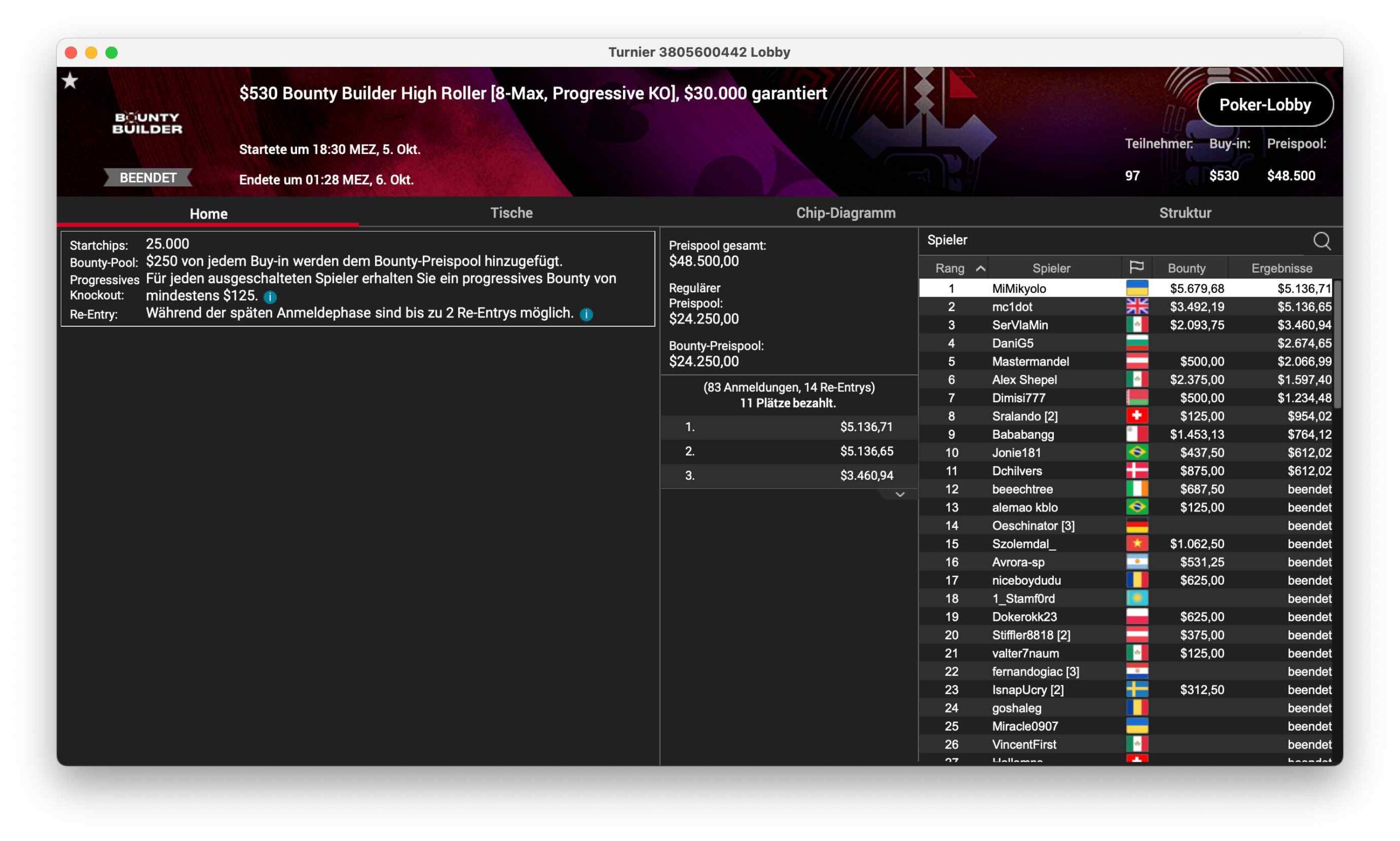 97 Entries kamen im großen $530 Bounty Builder HR zusammen. $48.500 summierten sich so im Preispool an. „MiMikyolo“ spielte sich an die Spitze und nahm $5.679 + $5.136 aus dem Turnier mit.