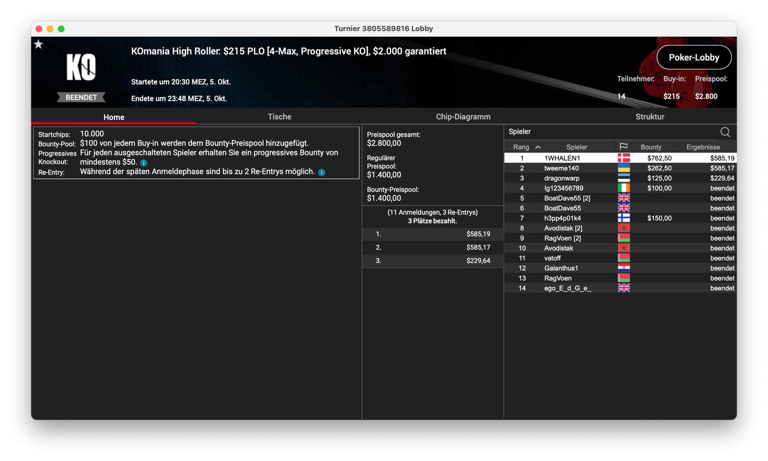 Das $215 KOmania High Roller hatte 14 Entries und $2.800 Preispool. „1WHALEN1“ aus Dänemark gewann für $762 + $585.