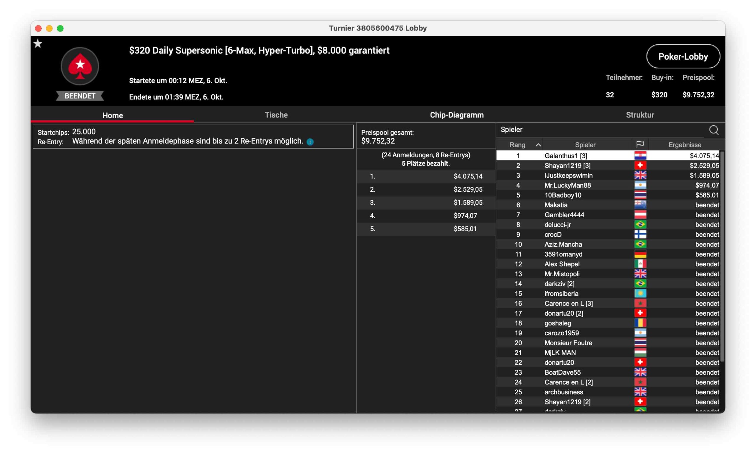 Einzige Ausnahme war der Schweizer „Shayan1219“, der als Runner-Up das $320 Daily Supersonic beendete. 32 Entries sorgten hier für $9.752 im Preispool. Der Sieg ging nach Kroatien an „Galanthus1“ für $4.075. Der Runner-Up war mit $2.529 dotiert. Bereits vorgestern hatte der Schweizer Spieler den Sieg knapp verpasst.