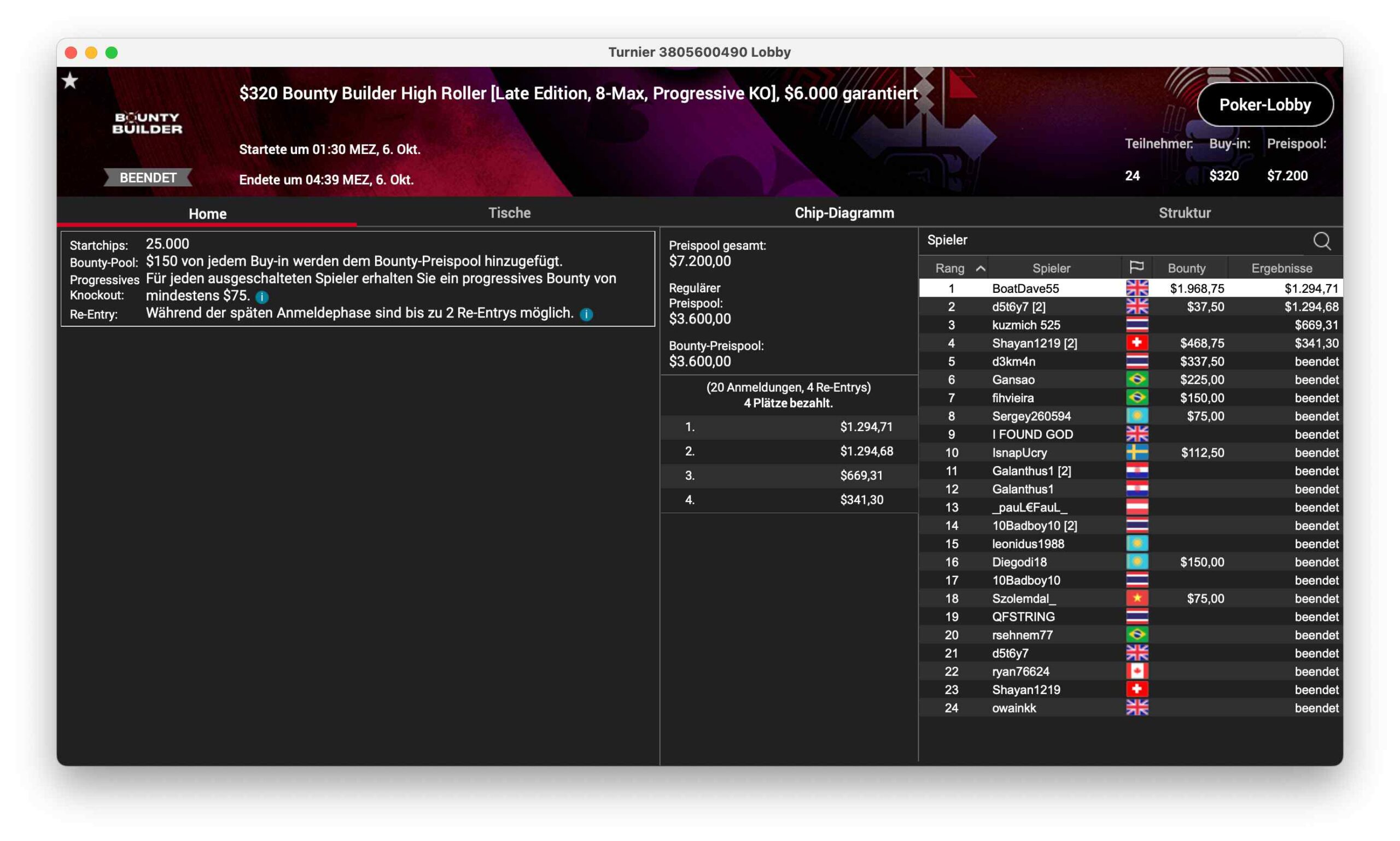 Das $320 Bounty Builder HR hatte 24 Entries und $7.200 Preispool. „BoatDave55“ aus dem Vereinigten Königreich schnappte sich den Sieg und $1.968 + $1.294. „Shayan1219“ wurde hier Vierter für $468 + $341.
