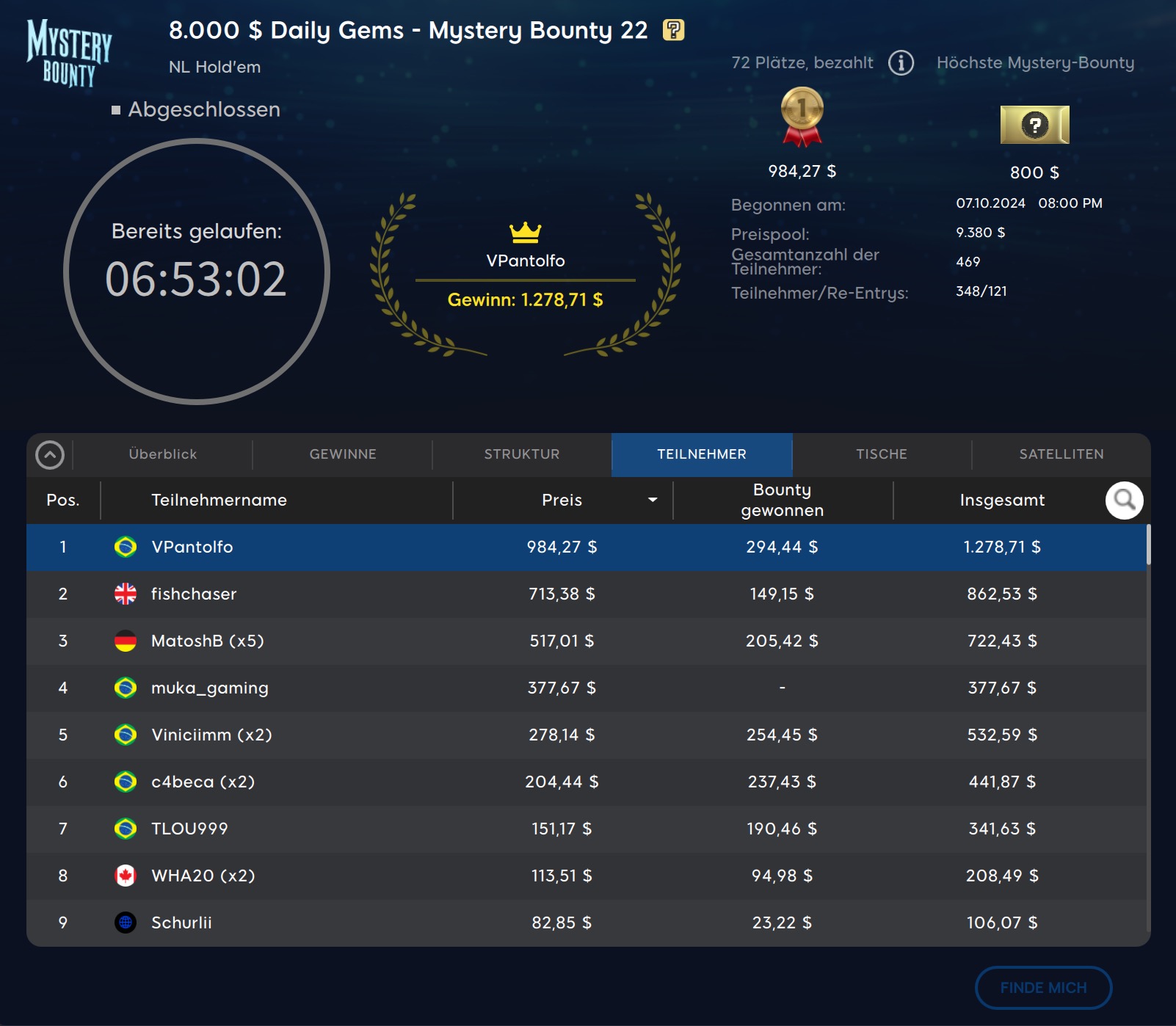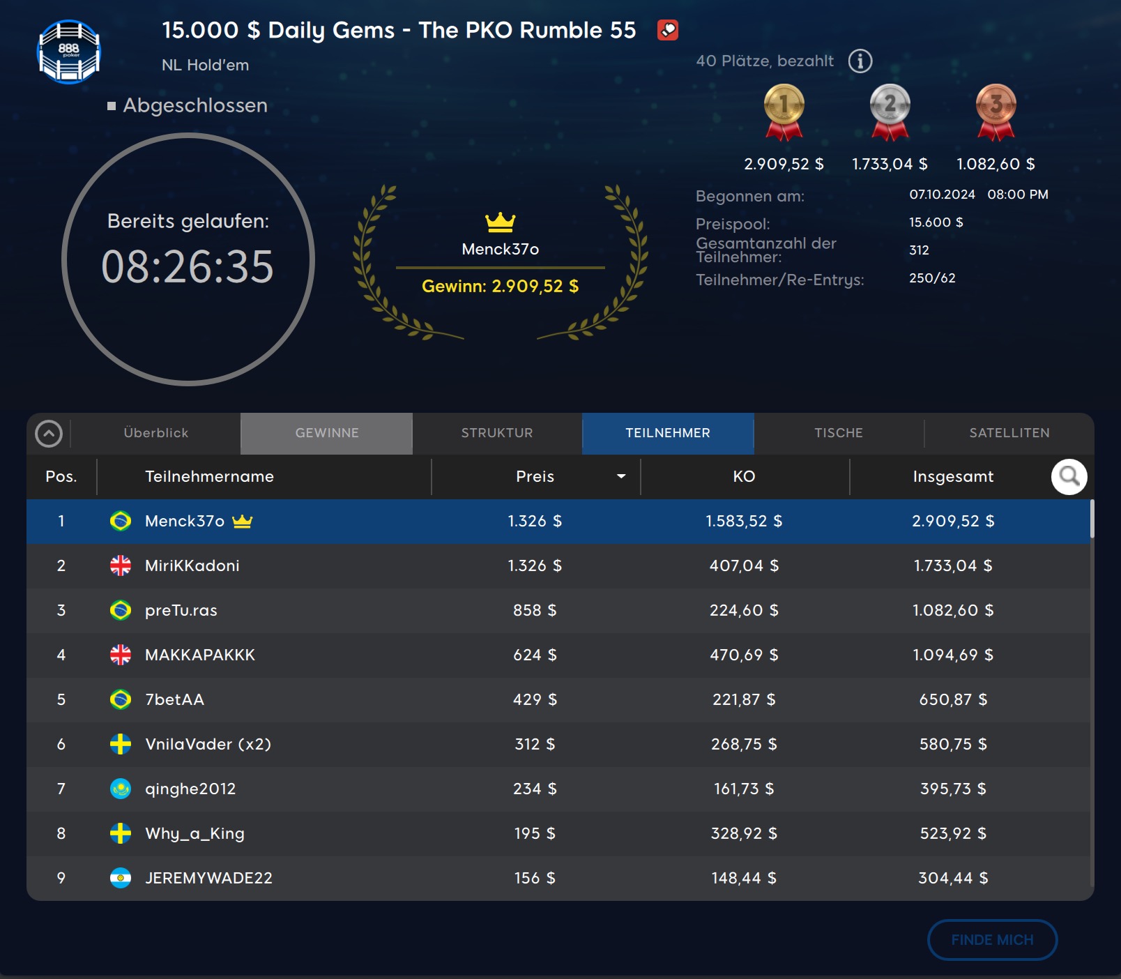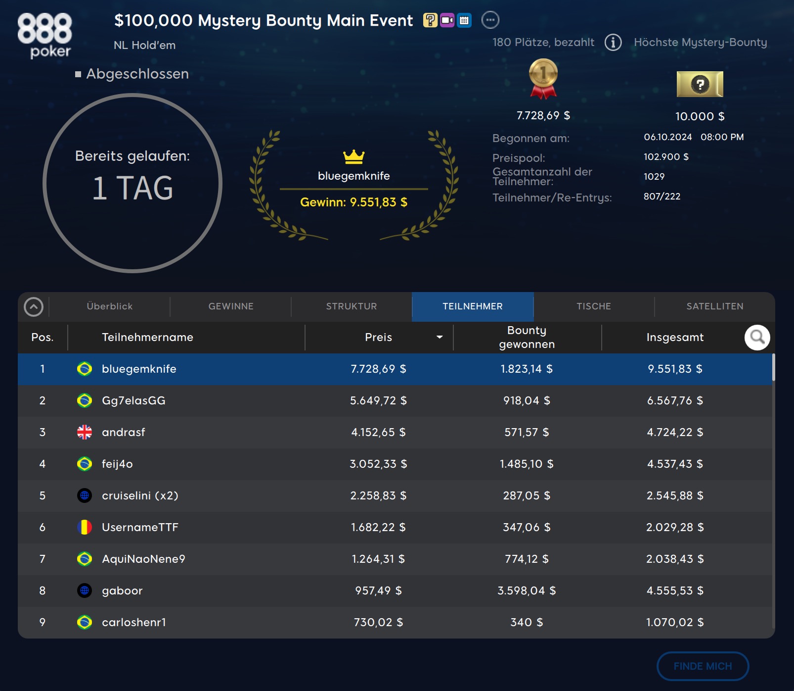 Mit „gaboor“ saß auch einer der fleißigsten Kopfgeldsammler am Finaltisch. Zu seinen $35.98 an gesammelten Bountys kam am Finaltag keine weitere mehr hinzu, dafür allerdings $957 Payout für Rang 8. „cruiselini“, der zweite Spieler ohne Standortangabe schied auf Rang 5 mit insgesamt $2.545 an Payouts aus, „feij4o“ aus Brasilien wurde 4. für kombinierte $4.537. Mit dem Bustout von „andrasf“ aus Großbritannien als Drittem, mit $4.152 Platzierungs- und $571 Bounty-Payout kam es zu einem brasilianischen Heads-Up.