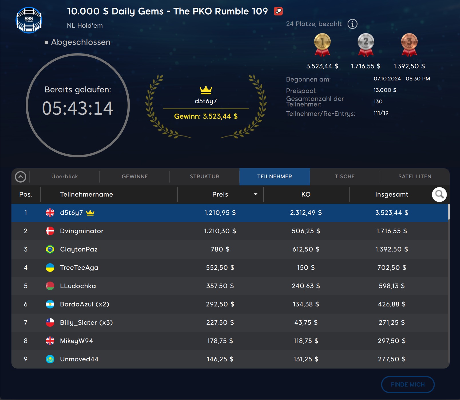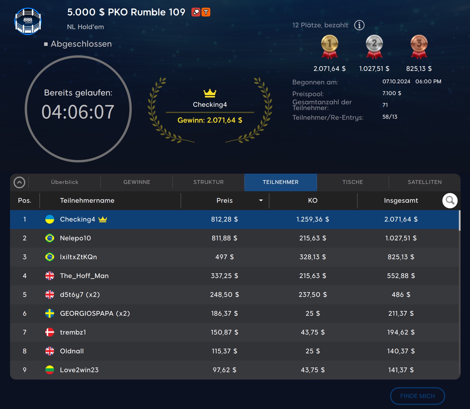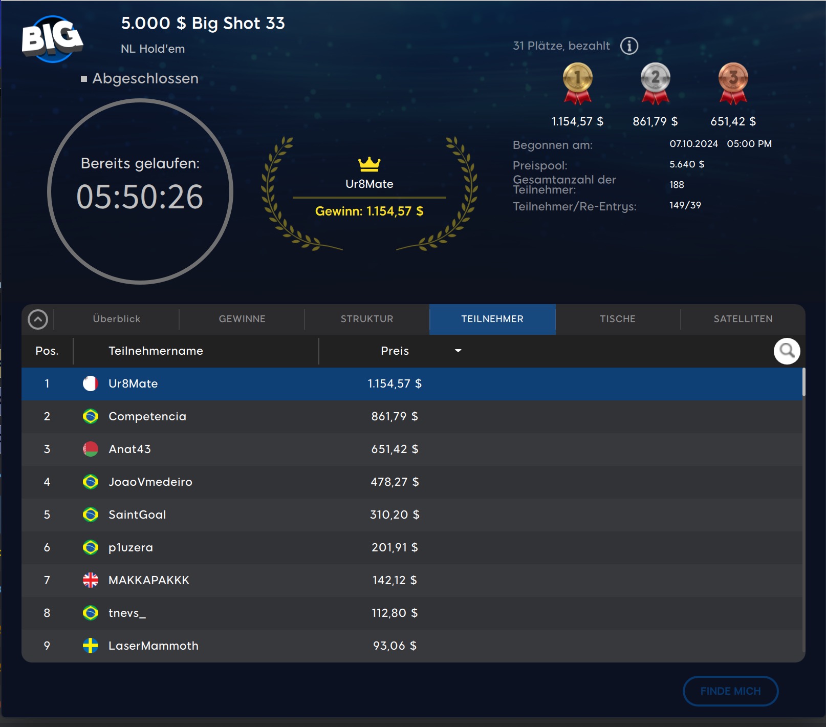 Mit „gaboor“ saß auch einer der fleißigsten Kopfgeldsammler am Finaltisch. Zu seinen $35.98 an gesammelten Bountys kam am Finaltag keine weitere mehr hinzu, dafür allerdings $957 Payout für Rang 8. „cruiselini“, der zweite Spieler ohne Standortangabe schied auf Rang 5 mit insgesamt $2.545 an Payouts aus, „feij4o“ aus Brasilien wurde 4. für kombinierte $4.537. Mit dem Bustout von „andrasf“ aus Großbritannien als Drittem, mit $4.152 Platzierungs- und $571 Bounty-Payout kam es zu einem brasilianischen Heads-Up.