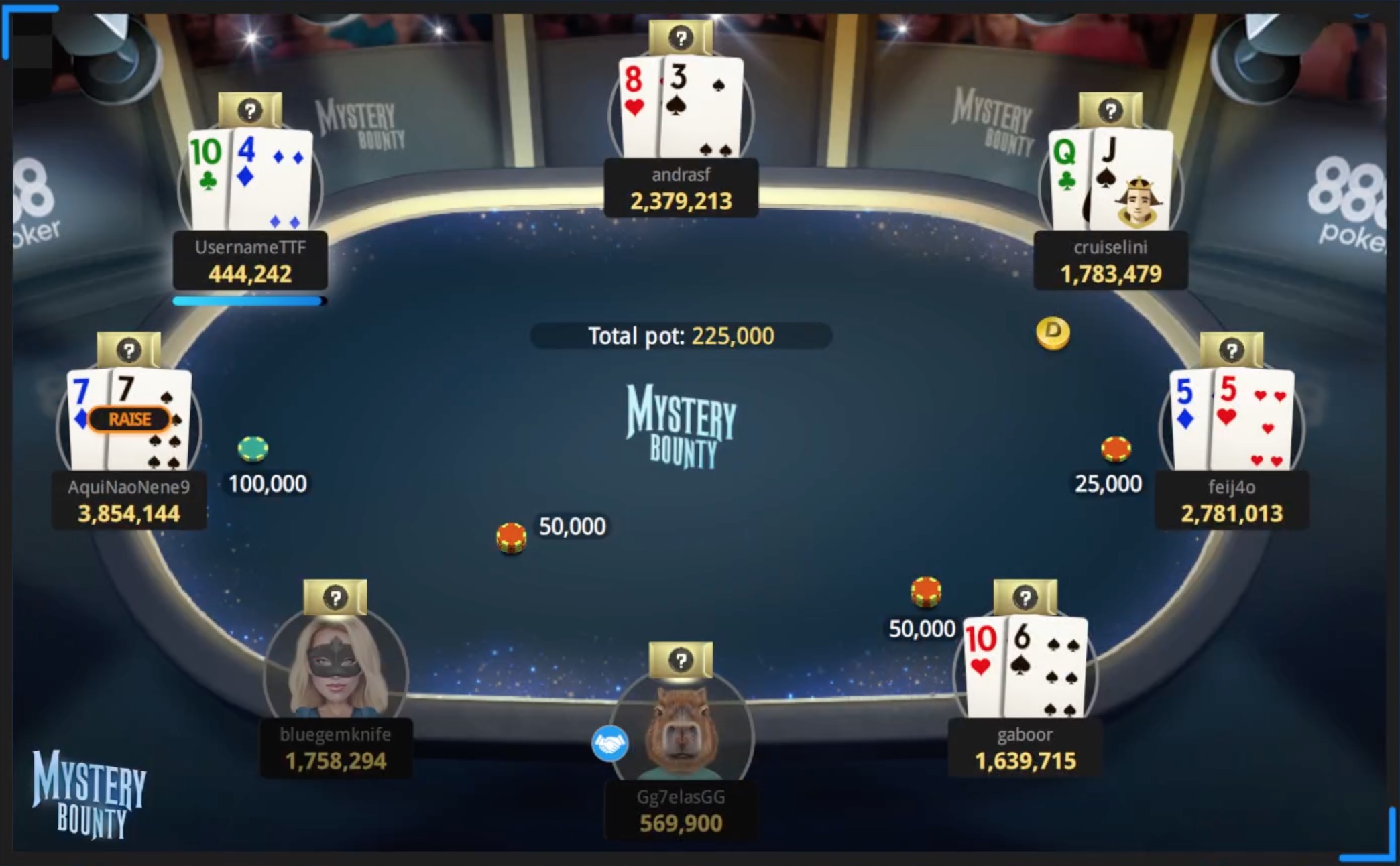 Hier sollte am Ende „bluegemknife“ gegen „Gg7elasGG“ die Nase von behalten. In einem längeren Duell war es der Call mit geriverten Two Pair von „bluegemknife“ gegen den mutigen Riverbluff von „Gg7elasGG“ mit 7-high, der die Entscheidung brachte. Damit gingen kombinierte $6.567 Payouts an „Gg7elasGG“, während sich „bluegemknife“ über $7.728 Siegprämie und $1.823 an Mysteriösen Bountys (inklusive seiner eigenen) freuen konnte.