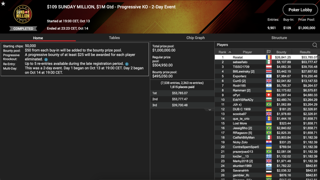 Fangen wir auch direkt mit dem $109 Sunday Million an. Das Turnier hatte eine $1 Million Garantie, die bei 9.901 Entries nicht erreicht werden konnte. Das Spiel stoppte am Sonntag, als noch 80 Spieler im Rennen waren und diese kehrten gestern an die virtuellen Tische zurück, um den Sieger und neuer Besitzer von $53.785 plus Bounties zu ermitteln. Die beste DACH-Platzierung legte der unter österreichischer Flagge spielende ‚TISSO1709‚ hin. Er landete auf Platz 3 für $39.700 plus $4.682 an Bounties. Der Sieger kam allerdings aus Rumänien. ‚Rsiatat‚ konnte dafür $53.785 plus saftigen $26.841 mit nach Hause nehmen.