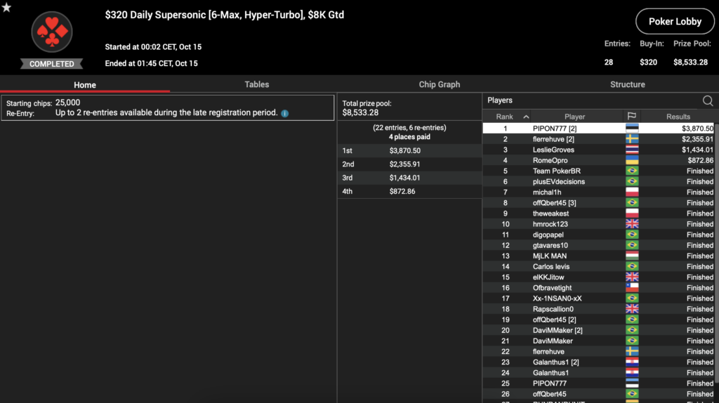 Als nächstes schauen wir uns das $320 Daily Supersonic an. Die $8.000 Garantie wurde bei 22 Entries knapp überboten. Fünf Plätze teilten den $8.533 Preispool untereinander auf und ganz oben auf dem Siegertreppchen stand am Ende der estnische Spieler ‚PIPON777‚ für einen $3.870 Zahltag.