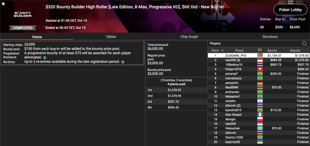 Zu guter Letzt hatten wir das $320 Bounty Builder High Roller Late Edition mit einer $6k Garantie. Auch hier wurde die Garantie exakt erreicht, da es 20 Entries gab. Vier Spieler wurden bezahlt und am Ende war es ‚ZLblDeNb_PrO‚ aus Weißrussland, der den Top-Preis von $1.078 plus $1.134 an Bounties einstreichen konnte.