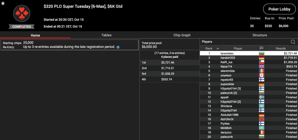 Es gab auch eine 4-Karten-Variante des wichtigsten Dienstags-Turniers, das $320 PLO Super Tuesday. Die $6.000 Garantie konnte mit 20 Entries genau erreicht werden und wurde auf vier Spieler verteilt. Der Deutsche ‚harakiri333‘ musste sich im Heads-up leider dem Bulgaren ‚tarantaleo‚ geschlagen geben. Dieser erhielt für den Sieg $2.721.