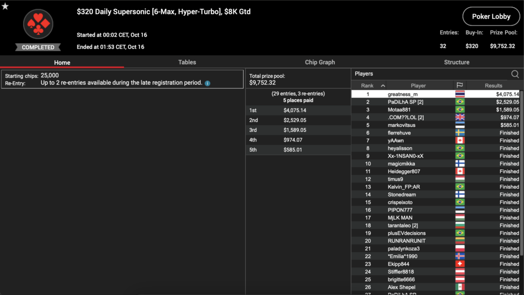 Als nächstes gab es das $320 Daily Supersonic mit einer $8k-Garantie, die mit 32 Entries überboten werden konnte. Fünf Spieler teilten den $9.752 Preispool untereinander auf und der Löwenanteil von $4.075 ging an ‚greatness_m‚ aus Thailand.