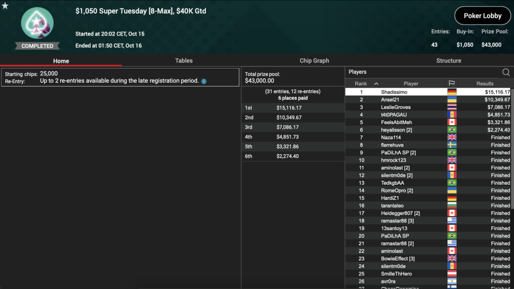 Gehen wir über zum wichtigsten Event des gestrigen Tages, dem $1.050 Super Tuesday. Die $40.000 Garantie konnte knapp überboten werden, denn es gab 43 Entries und somit einen $43.000 Preispool. Und wir können hier tatsächlich einen DACH-Sieg feiern. Niemand Geringerer als der High Roller Regular ‚Shadissimo‚ aus Deutschland konnte hier den Top-Preis von $15.116 mit nach Hause nehmen.