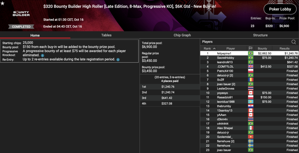 Und zu guter Letzt hatten wir noch das $320 Bounty Builder High Roller Late Edition mit einer $6.000 Garantie. 23 Entries sorgten für einen $6.900 Preispool und vier bezahlte Plätze. Drei dieser Plätze wurden von Brasilianern belegt, so auch der erste Platz. ‚felipepina1‚ konnte für seinen Sieg $1.240 plus $2.662 an Bounties einstecken.