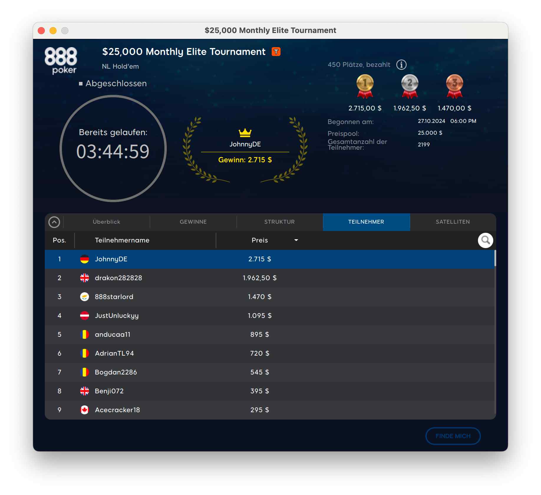 Einen deutschen Sieg gab es beim $25.000 GTD Monthly Elite – einem Freeroll Freezeout, bei dem Grinder, die viel auf 888 spielen eingeladen werden. Hier konnte sich „JohnnyDE“ den Sieg für $2.715 holen.