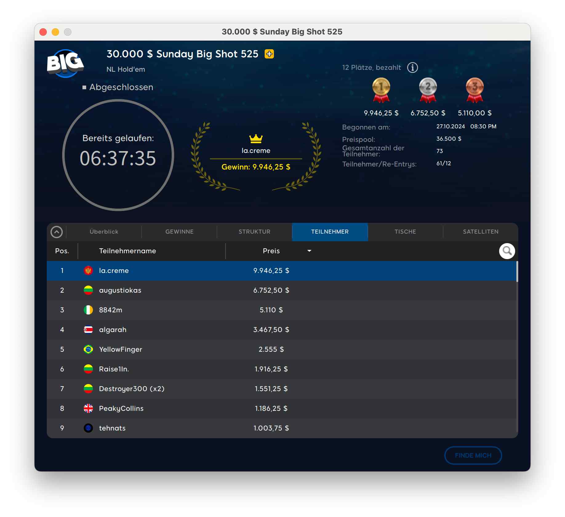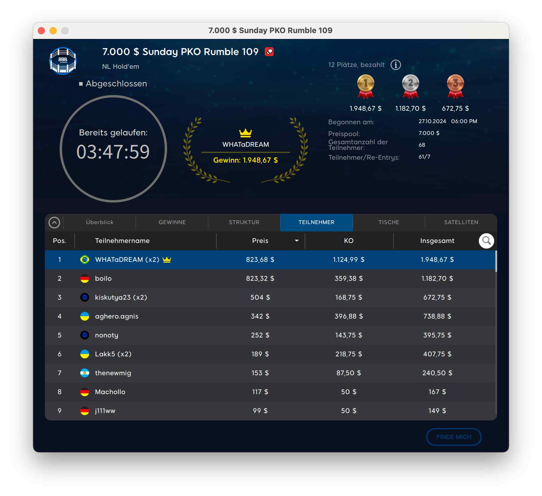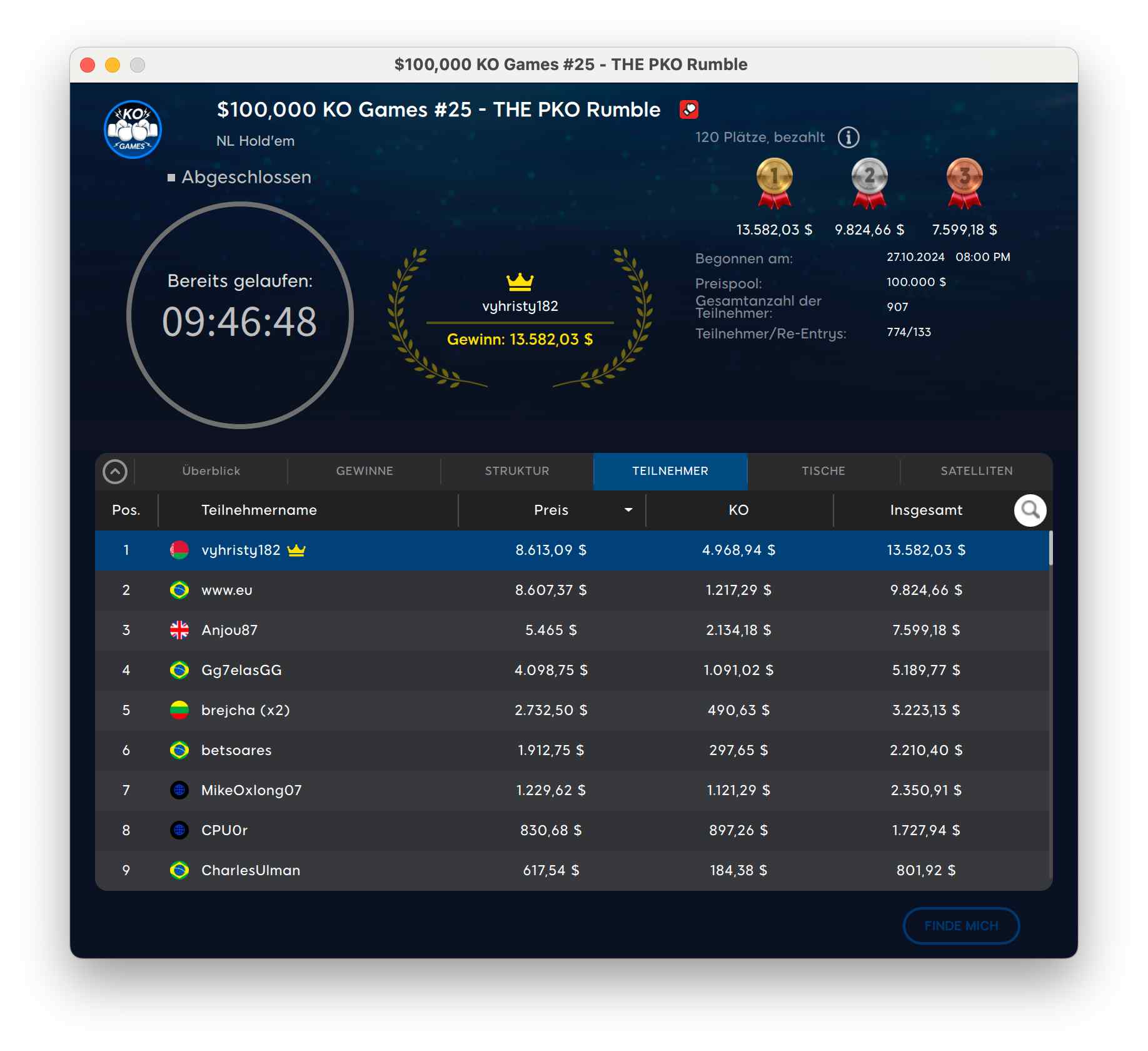 Das $100.000 KO Games The PKO Rumble hatte 907 Buy-Ins von 774 Spielern. Auch hier ging es um die Garantie. Den Sieg holte sich „vyhristy182“ für $8.613 + $4.986.