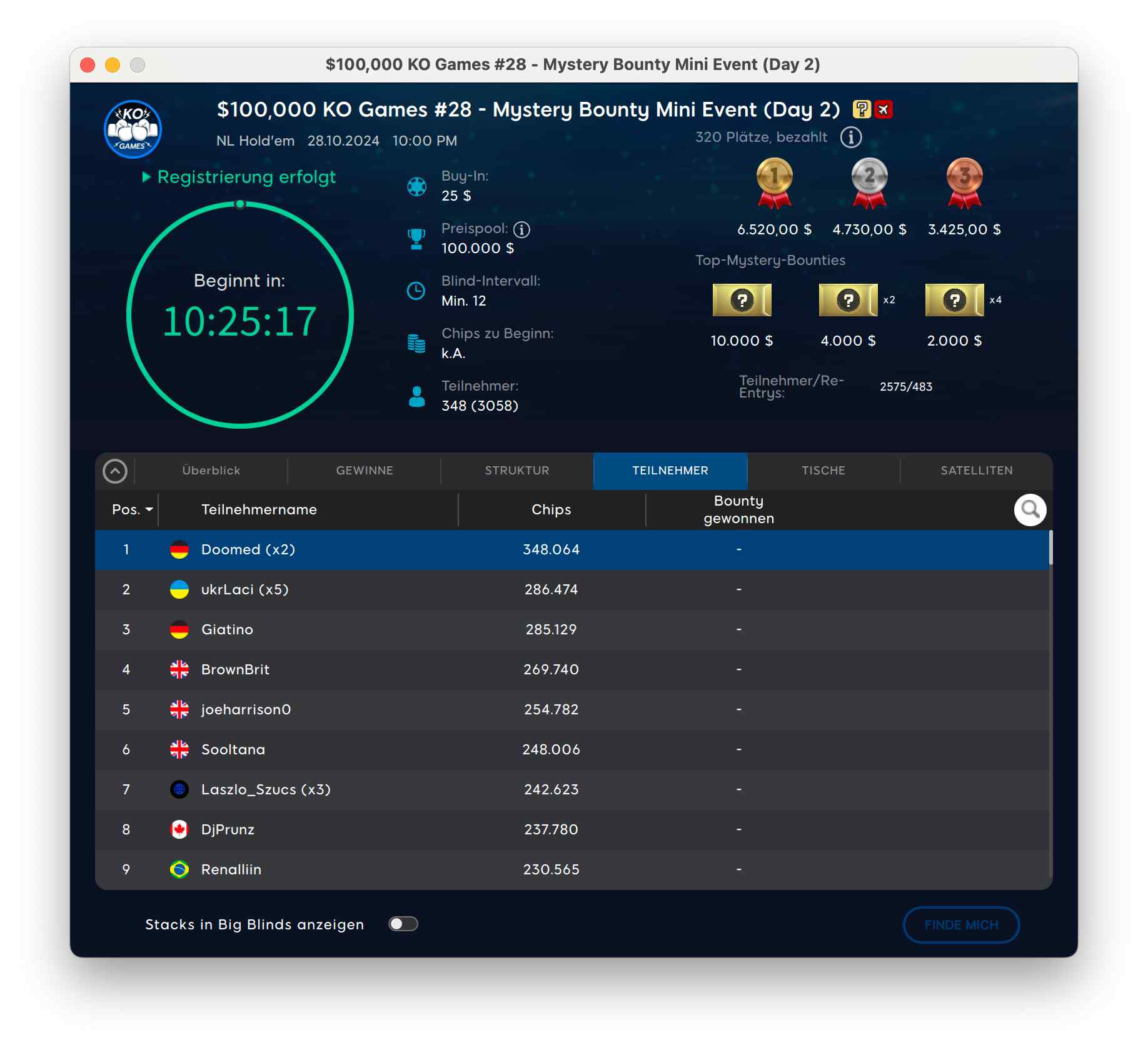 Das $25 KO Games Mystery Bounty Mini Event mit $100.000 Garantie wird derzeit vom deutschen Speiler „Doomed“ mit 358.000 Chips angeführt – heute Abend wird das Turnier entschieden.