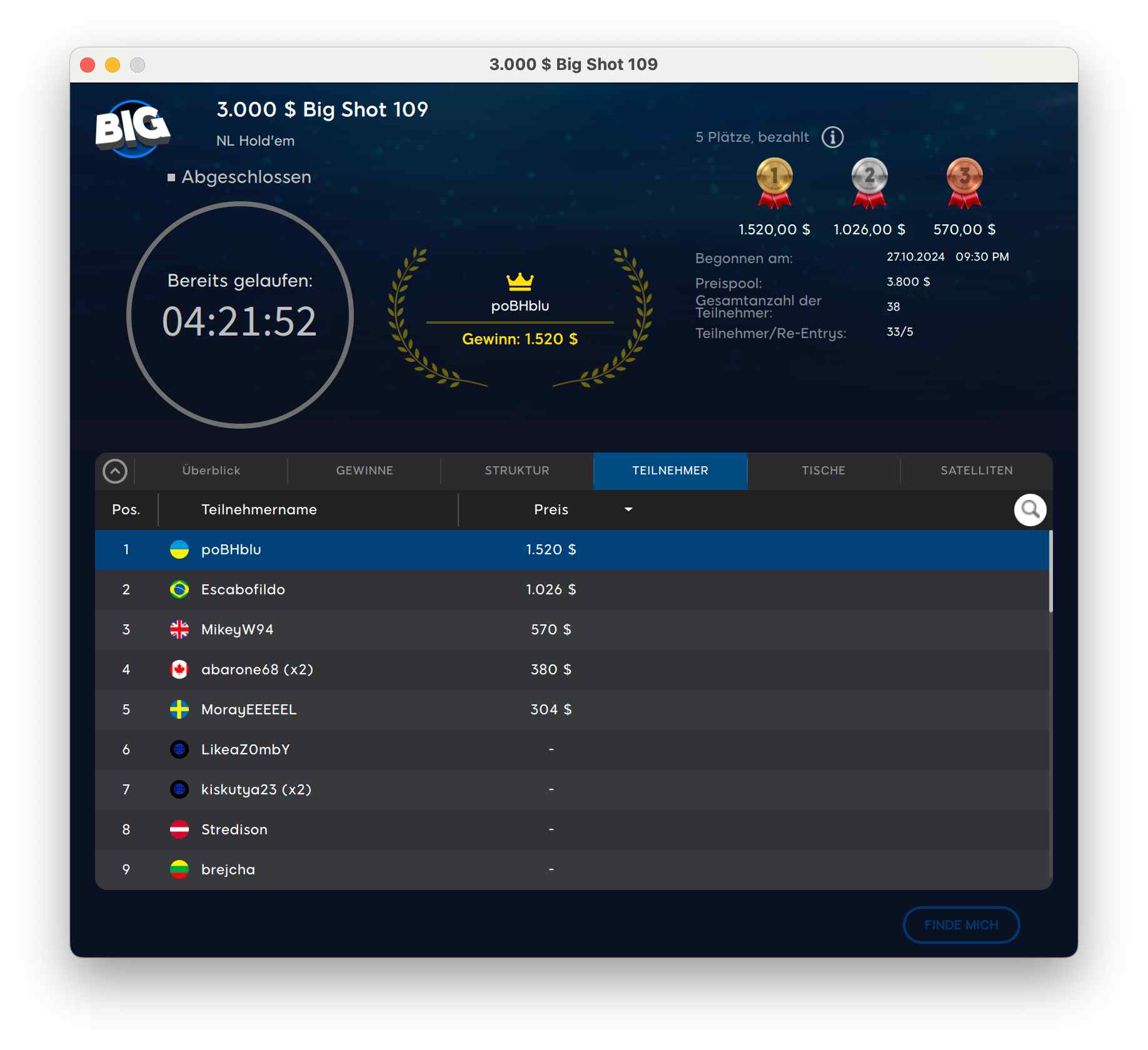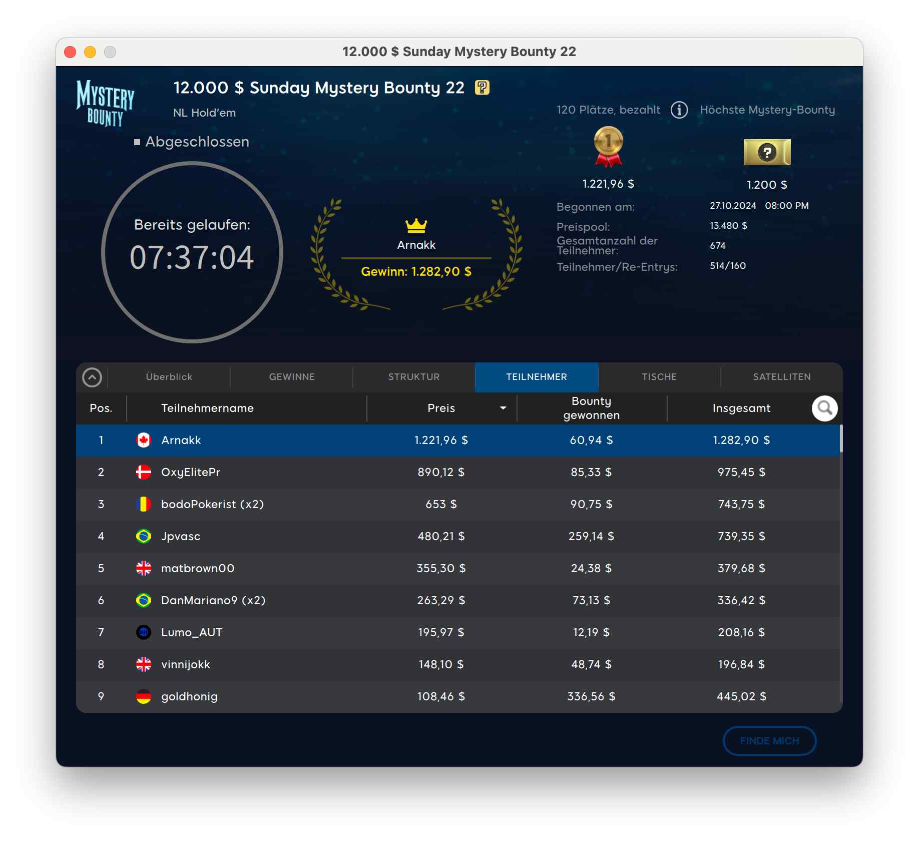 Das $40.000 KO Games Mystery Bounty hatte 789 Entries von 572 Spielern. Es ging um die Garantie. „PashuPushu“ gewann für $3.096 + $1.263.