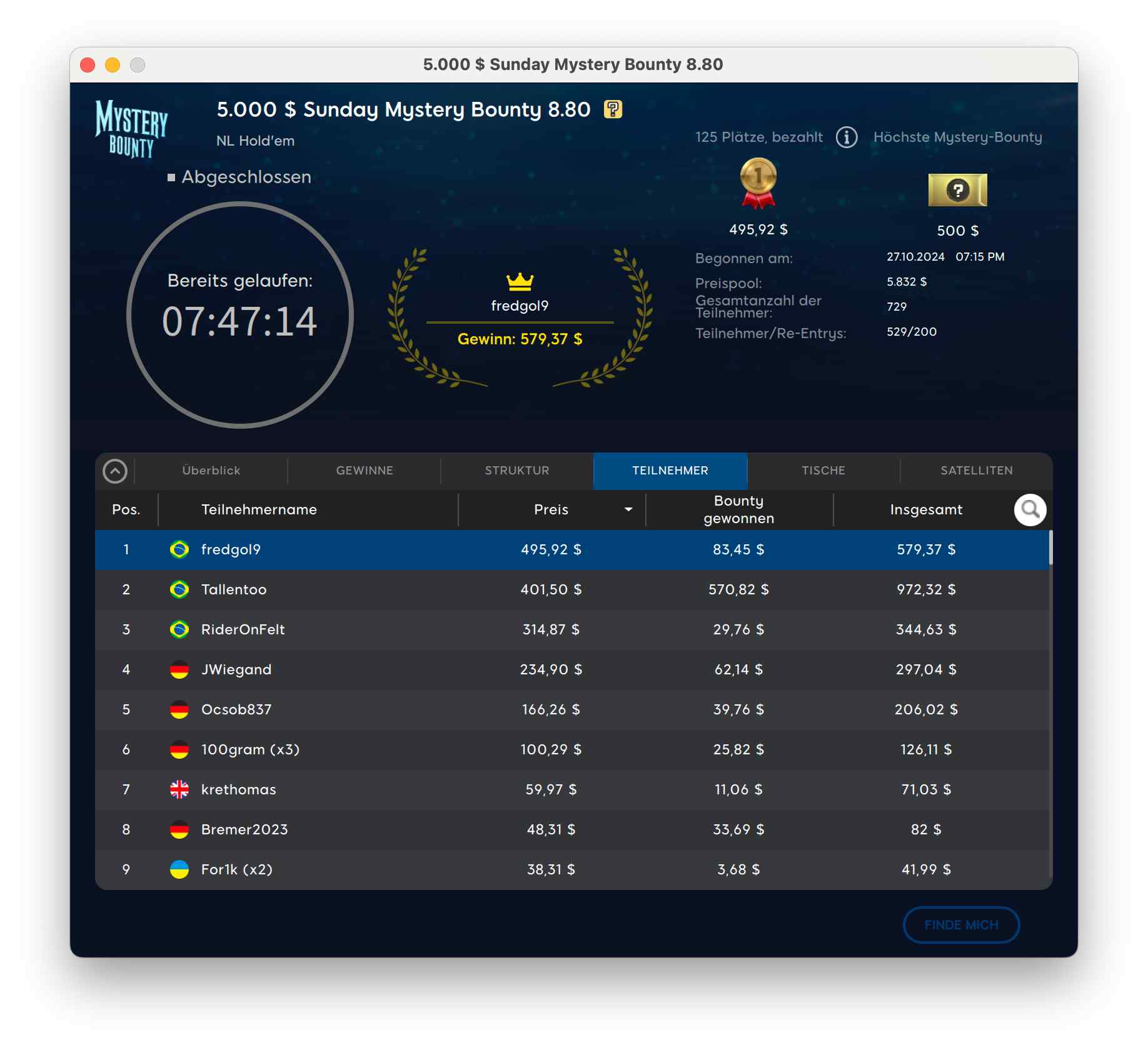 25.10.24 | 17:15 | KO Games #17 – Daily Gems – Mystery Bounty Mini | $8.80 | $5,000 |