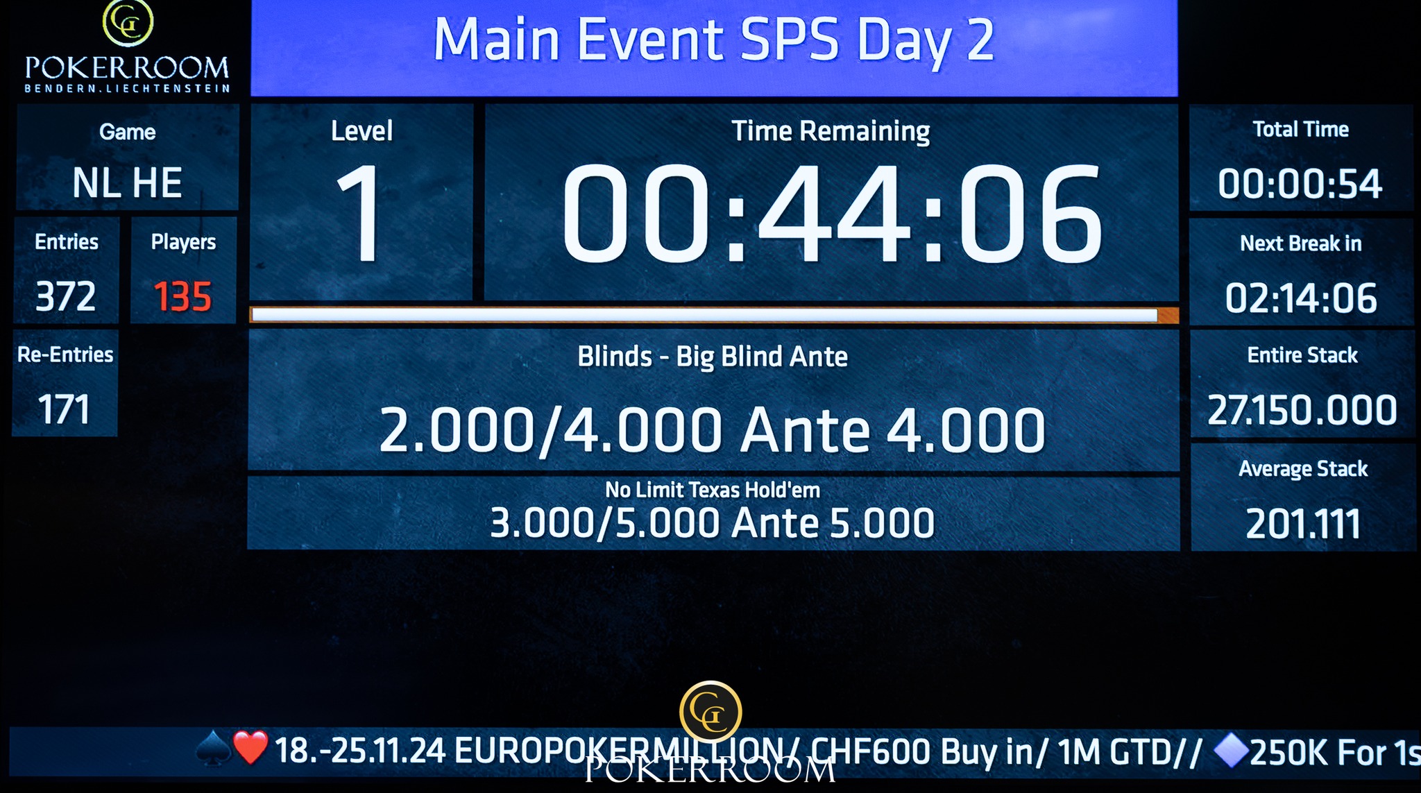Zudem wurde gestern noch der erste Tag des CHF 900 + 100 SPS High Roller gezockt. 19 Spieler entschieden sich für das Turnier, ein Re-Entry wurde gezogen. Im Pot liegen so CHF 18.000. Zwei Spieler cashen.